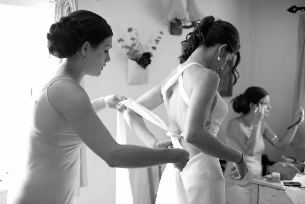 I love these moments before the ceremony — when the air is still and everything feels possible. The bride stands ready, light catching her veil, while her friend gently admires her shoes. Honest, natural moments like this tell the story of the day before it even begins.