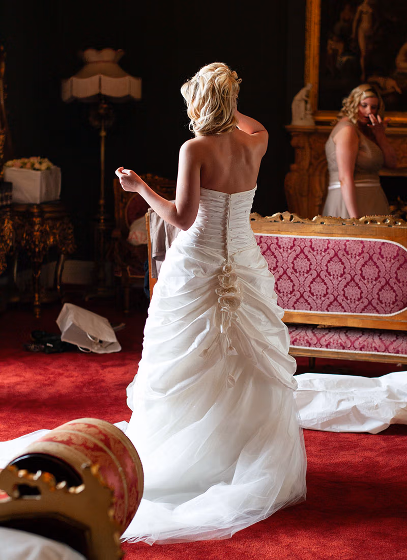 A naturally captured reportage moment — the bride stands on the red carpet in Allerton Castle’s bridal suite, her dress flowing behind her as she prepares for the day.