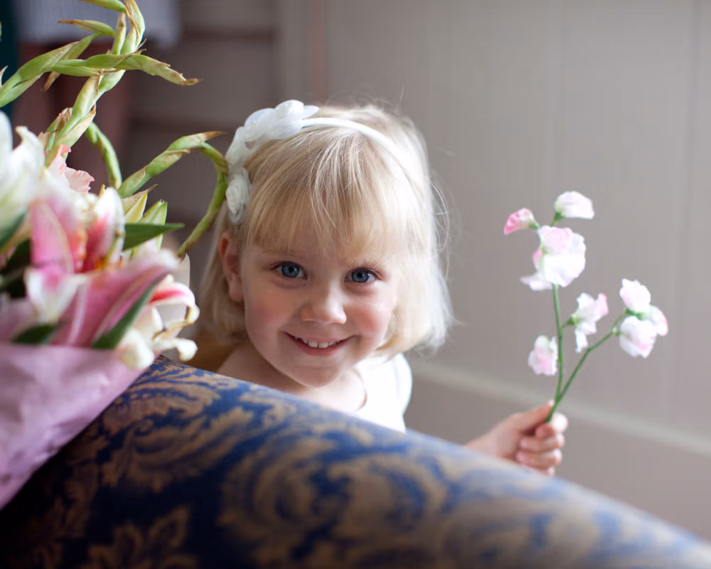 I love moments like this — a little bridesmaid peeping over the sofa, clutching her flowers and smiling at the camera. These are the unscripted parts of a wedding morning that tell such a real story.