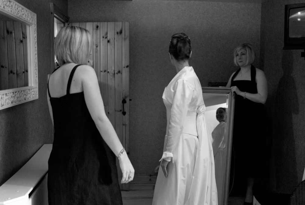 Soft daylight filtered through the windows at Simonstone Hall as Alison got ready with her sisters. A satin dress waited by the wardrobe, cream roses and feathers resting nearby. Outside, the hills were quiet and still — the kind of winter calm that settles a room before the day begins.