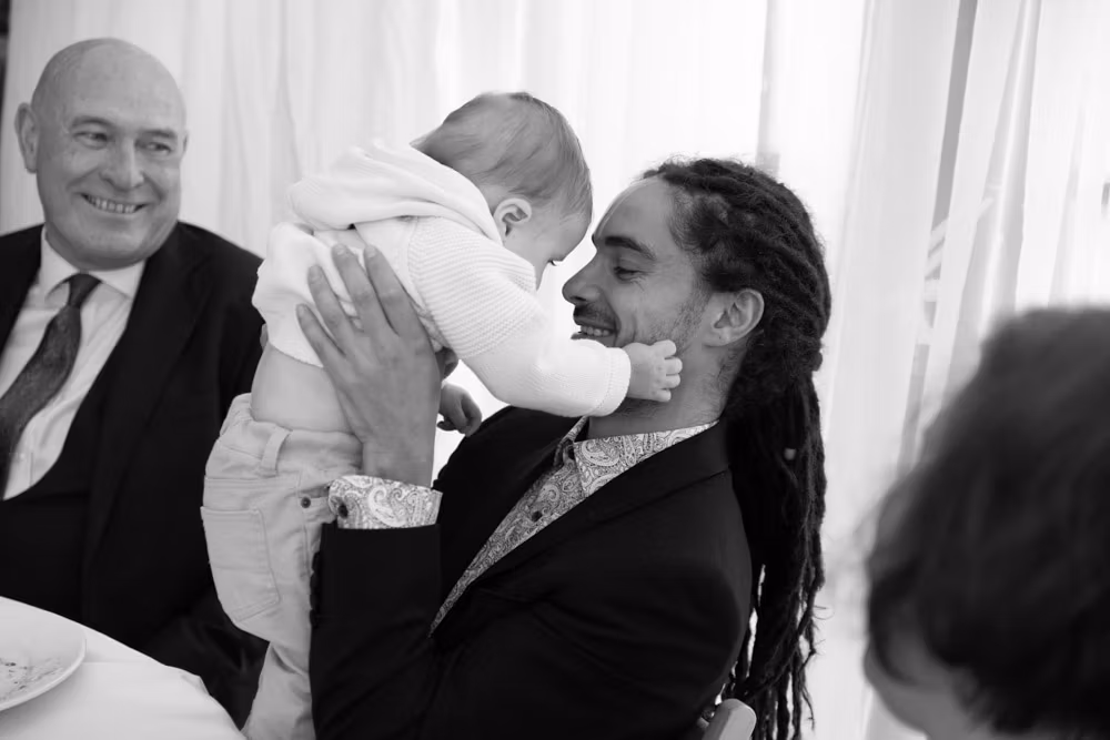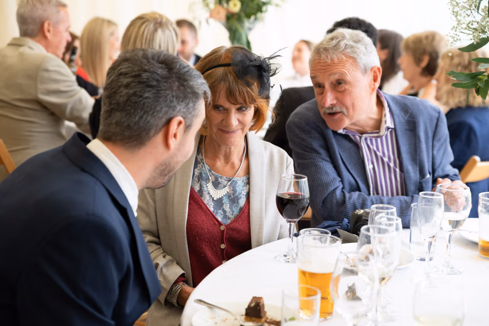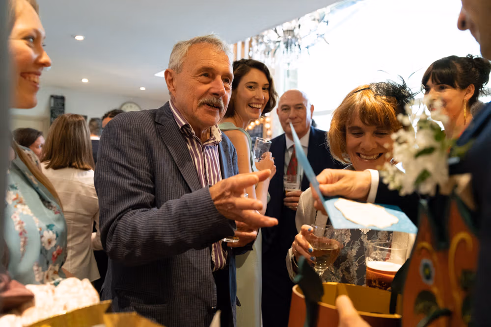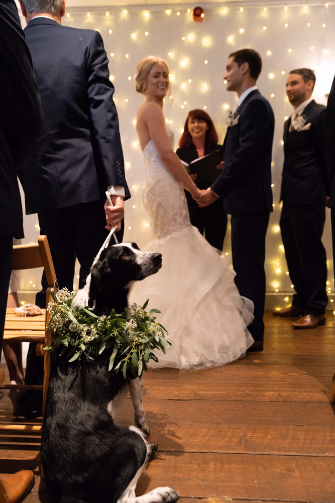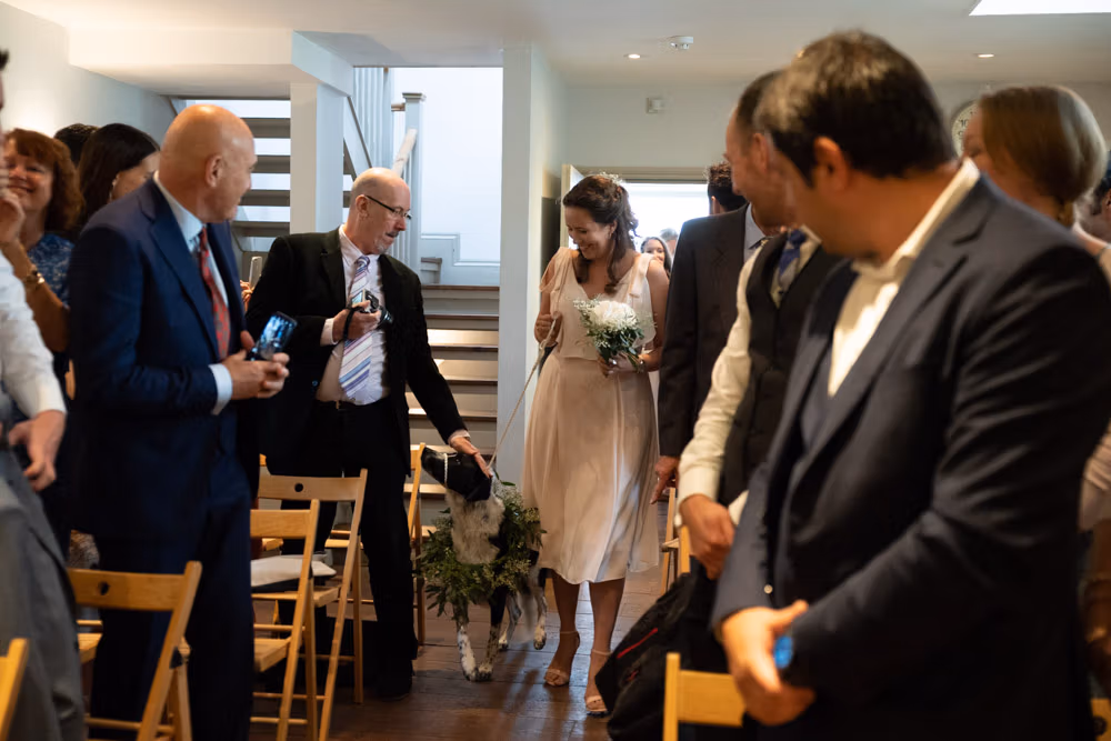 When I arrived, their rescue dog greeted me first — calm, curious, and proudly wearing his green floral collar, as if he knew he had an important part to play. Guests smiled as he wandered between them, soaking up the attention.
