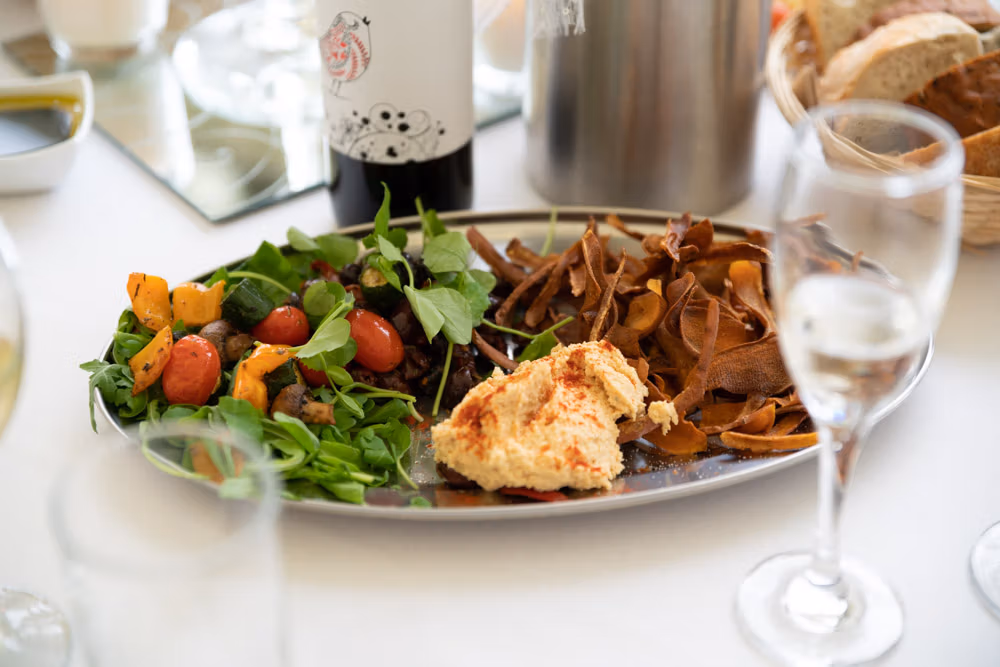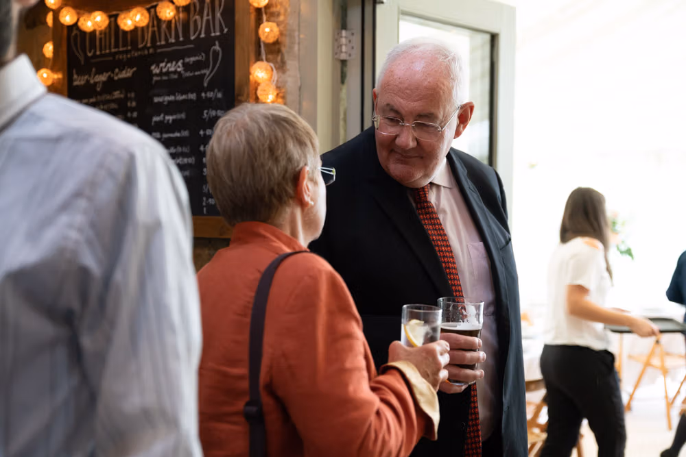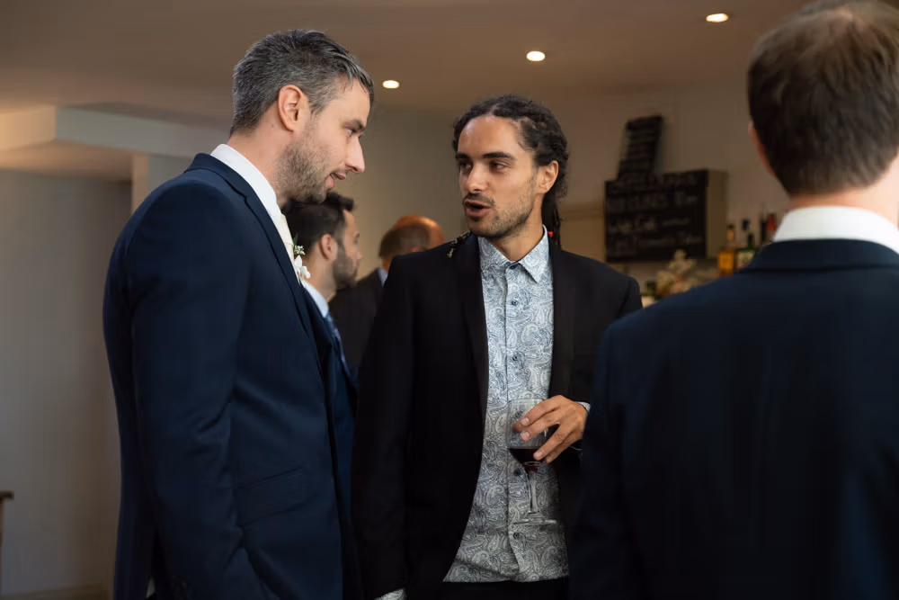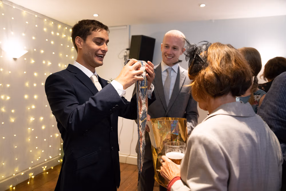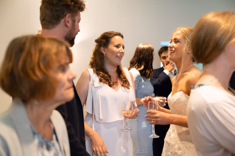 When I arrived, their rescue dog greeted me first — calm, curious, and proudly wearing his green floral collar, as if he knew he had an important part to play. Guests smiled as he wandered between them, soaking up the attention.