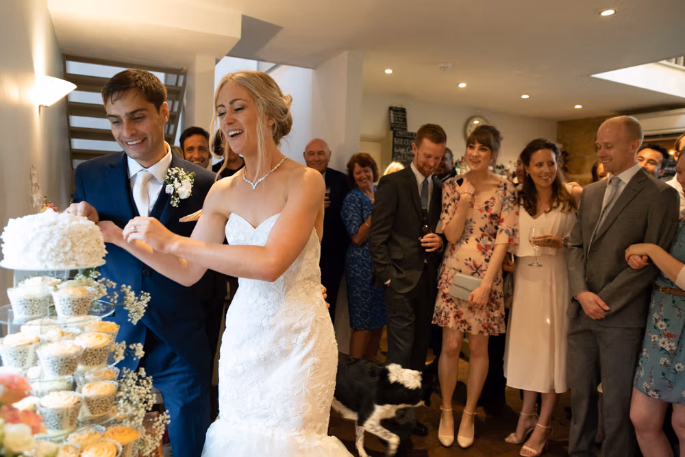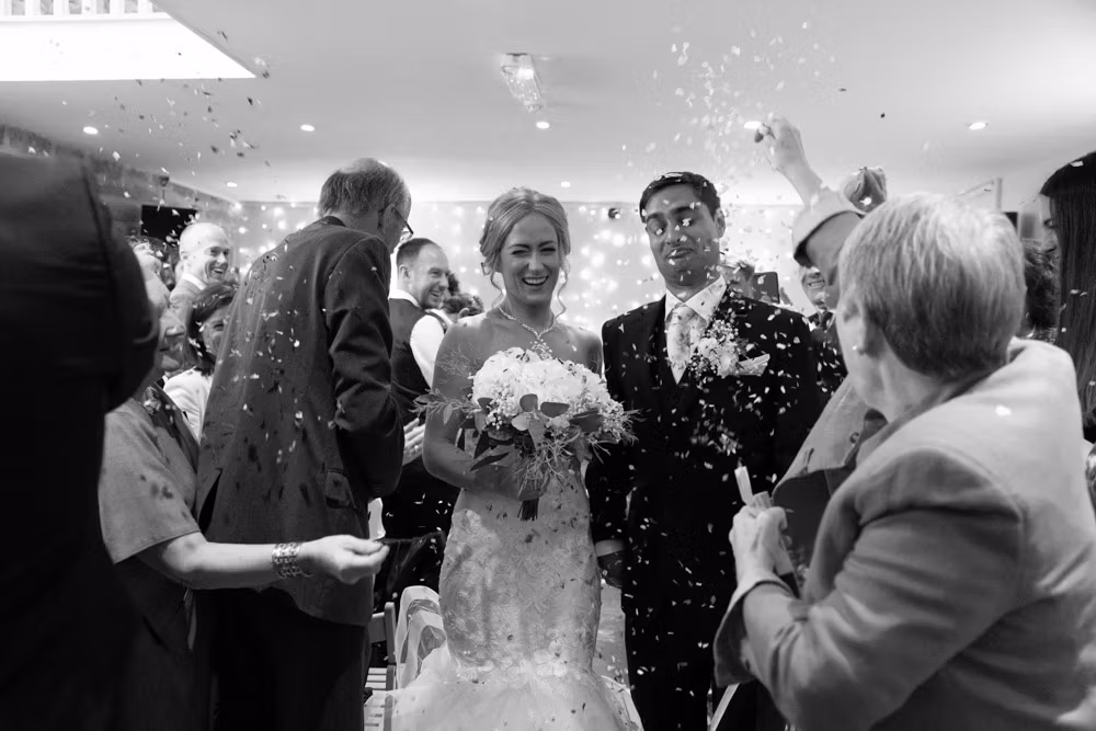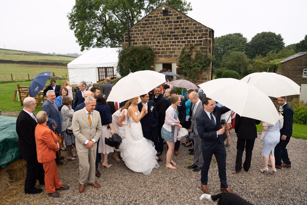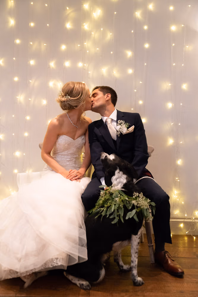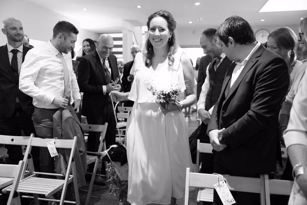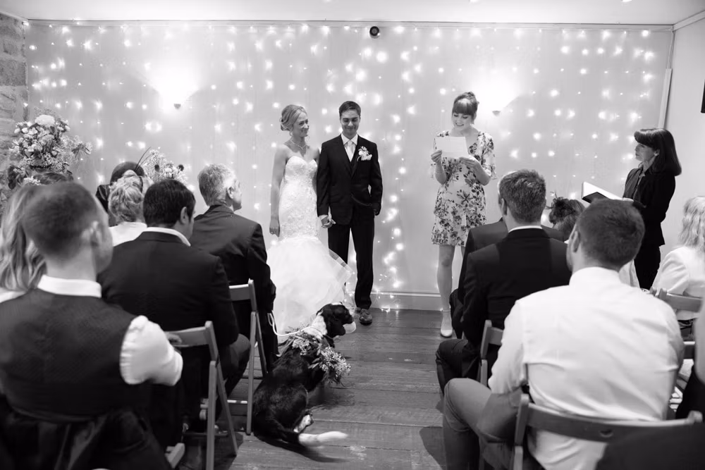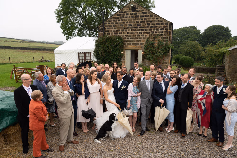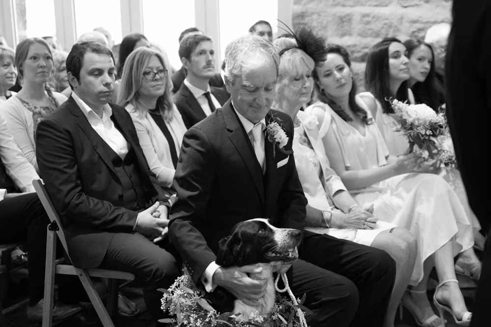 As a Leeds wedding photographer, I’ve photographed several celebrations here, but Helen & Adam’s day stood out — relaxed, joyful, and shared with their very well-behaved rescue dog greeting guests in the rain.