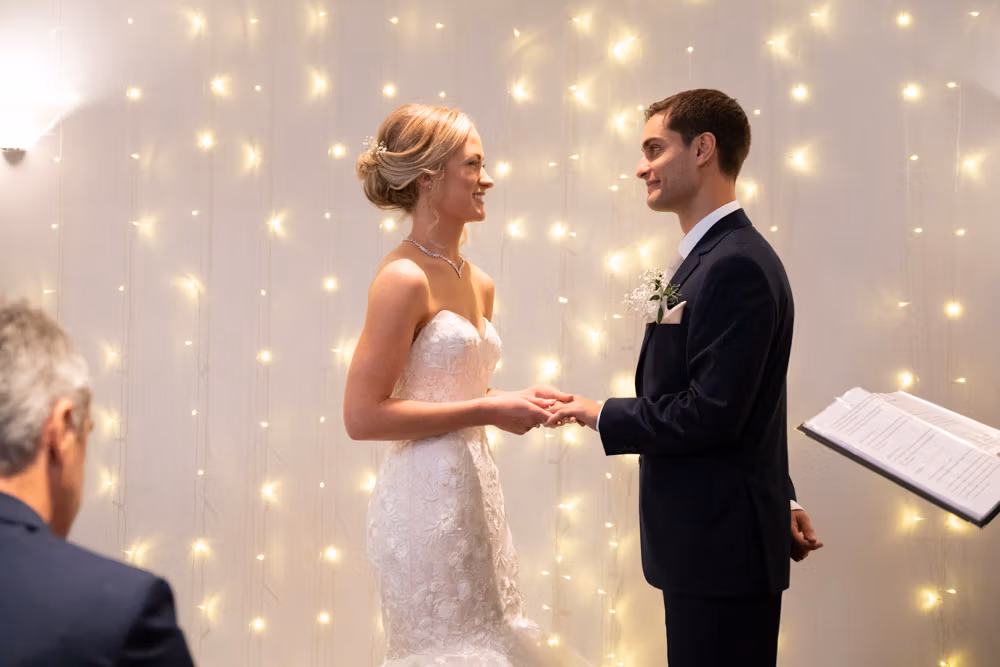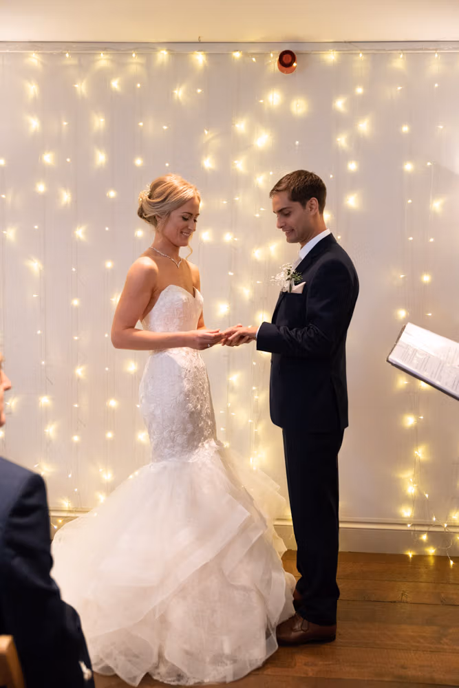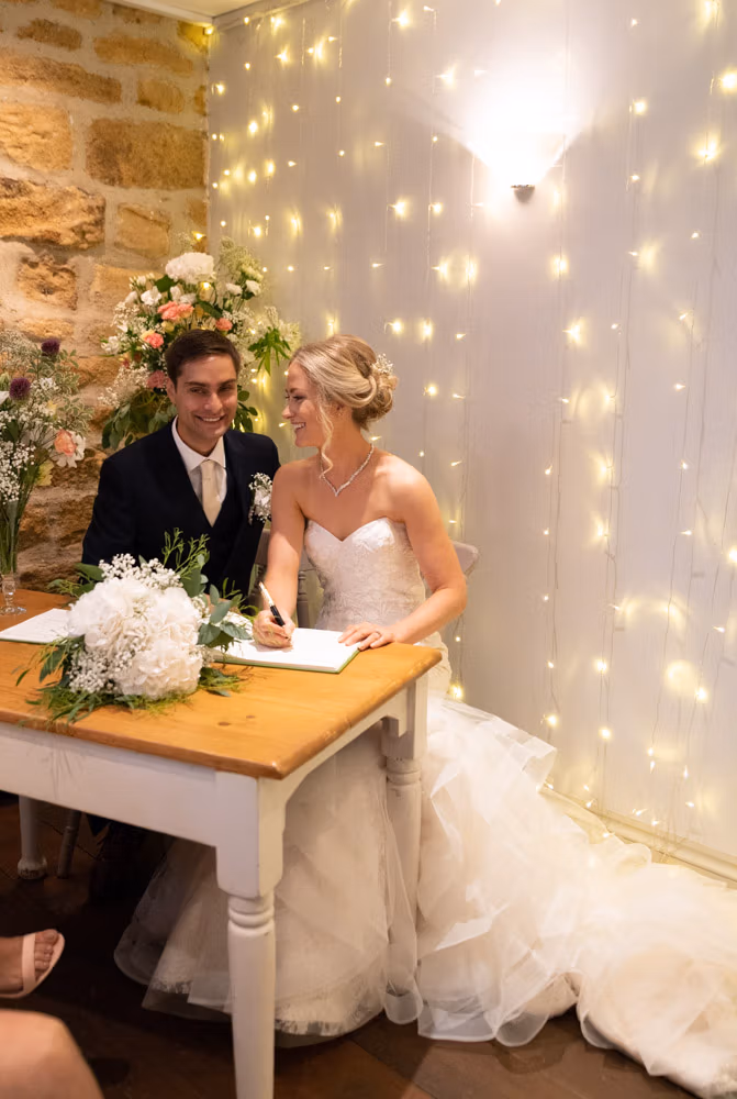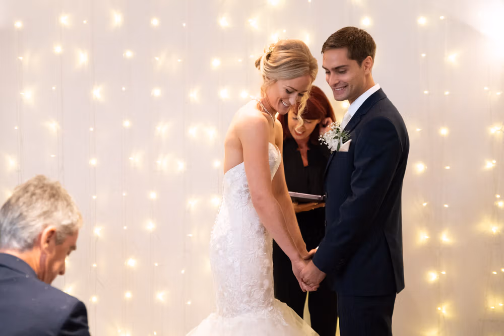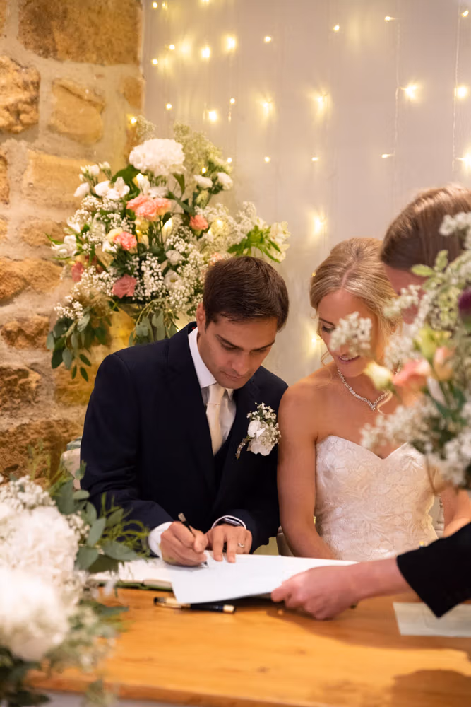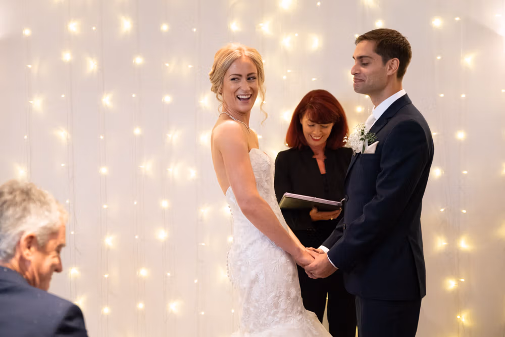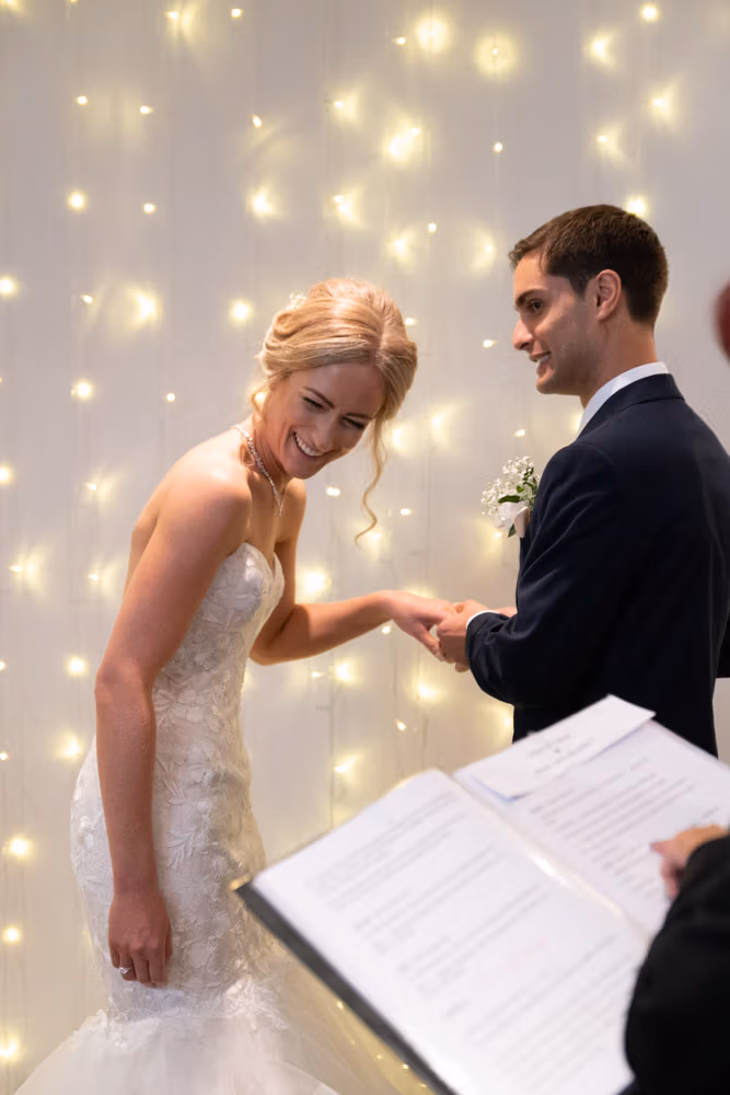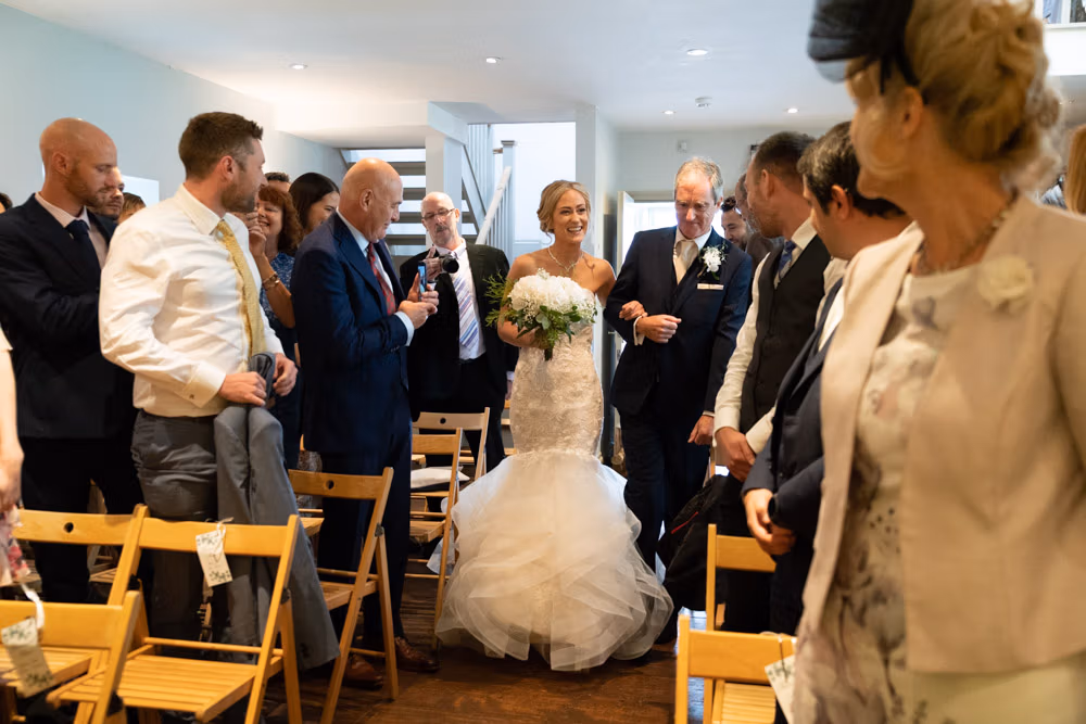 Inside, the ceremony room felt warm and full of light. Helen, calm but emotional, smiled as she walked down the aisle with her dad. Adam turned, beaming — and for a moment, everything outside fell still. Their vows were heartfelt and simple: just the two of them, surrounded by family, close friends, and the quiet hum of summer rain on the barn roof.