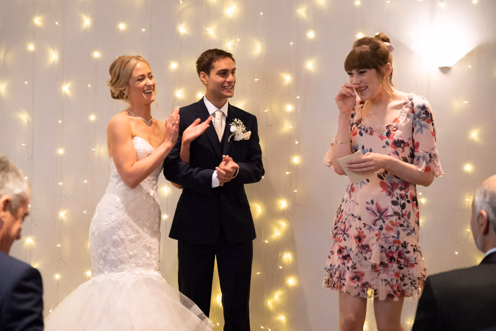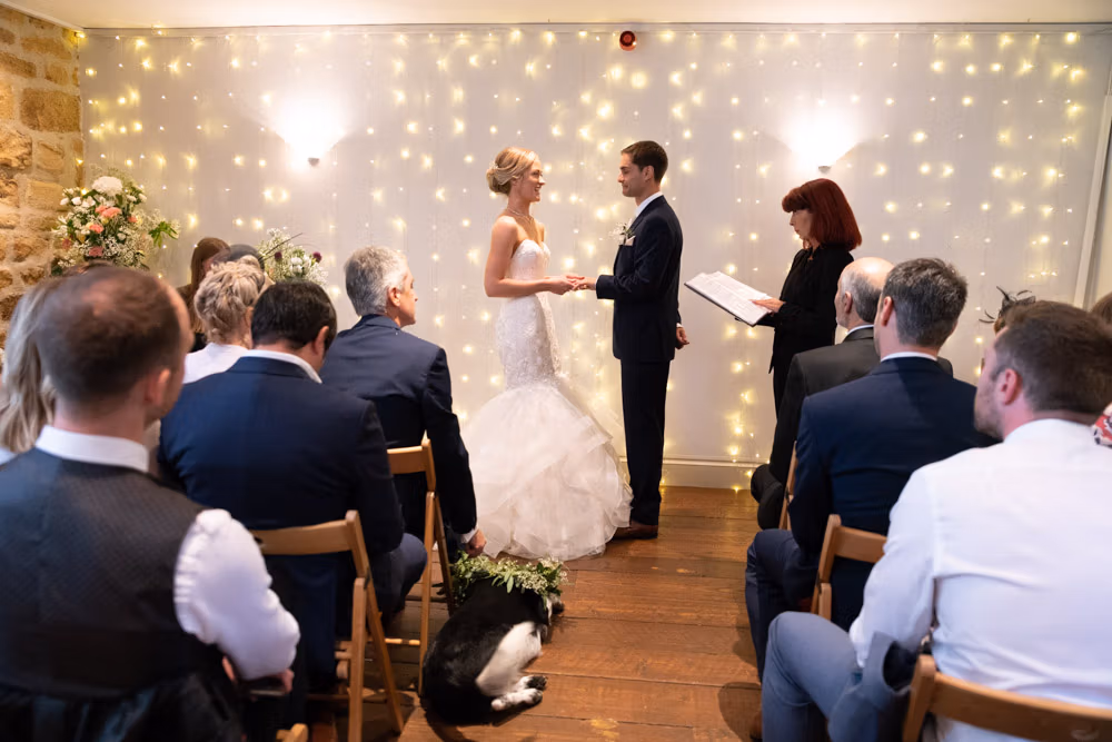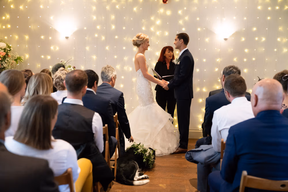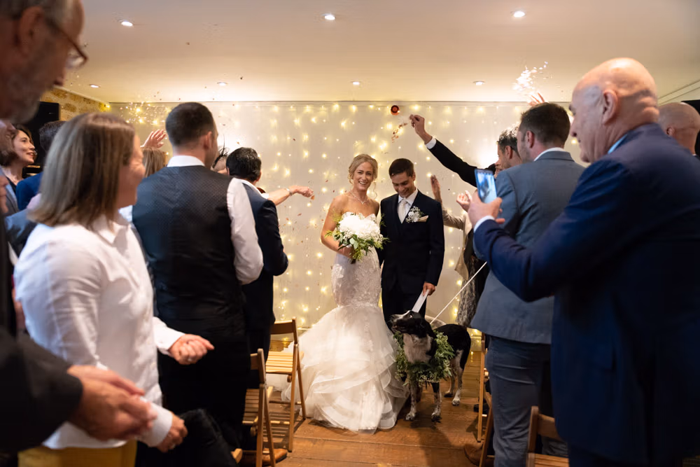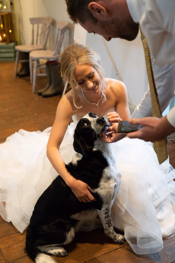 Throughout the day, their rescue dog was never far away — a gentle presence, always close by, always watching. During the vows he sat quietly near the front, occasionally glancing toward his humans as if keeping them in check. Later, as guests clapped and hugged, he became everyone’s favourite companion, soaking up affection wherever he went.