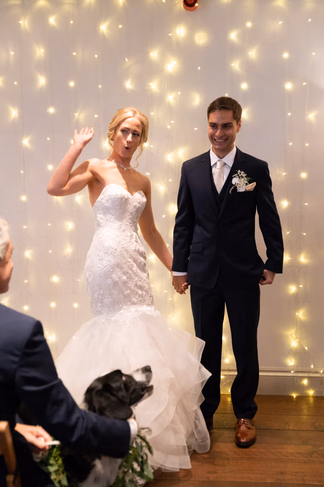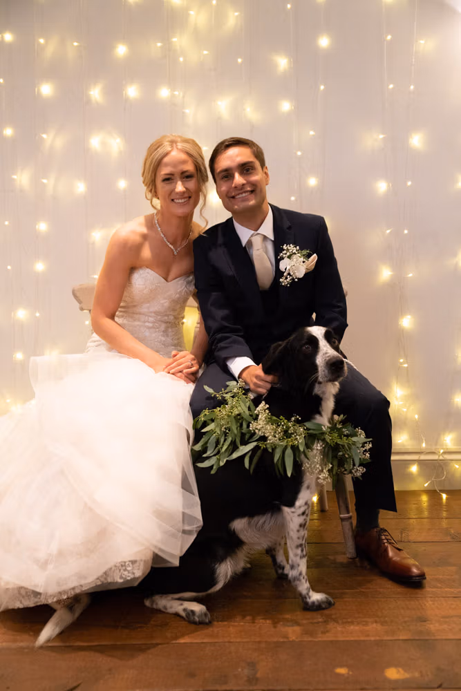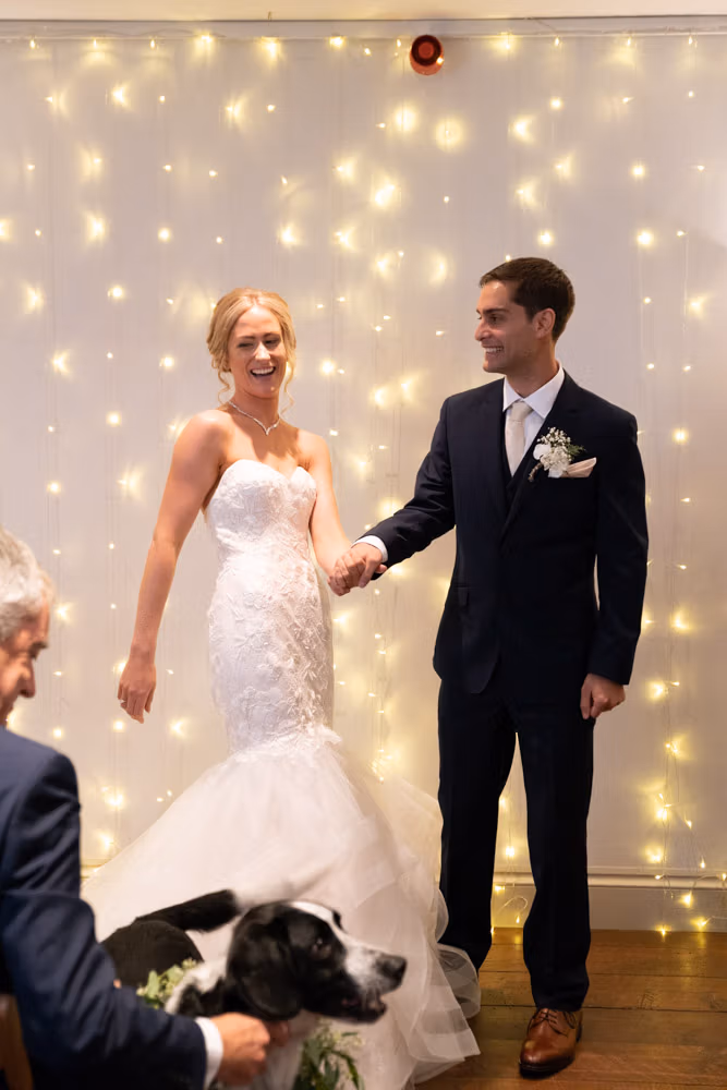 Some wedding days feel carefully staged. Others feel like life unfolding naturally. This was the latter — rain on leaves, a loyal dog at their heels, and a barn filled with people who mattered.