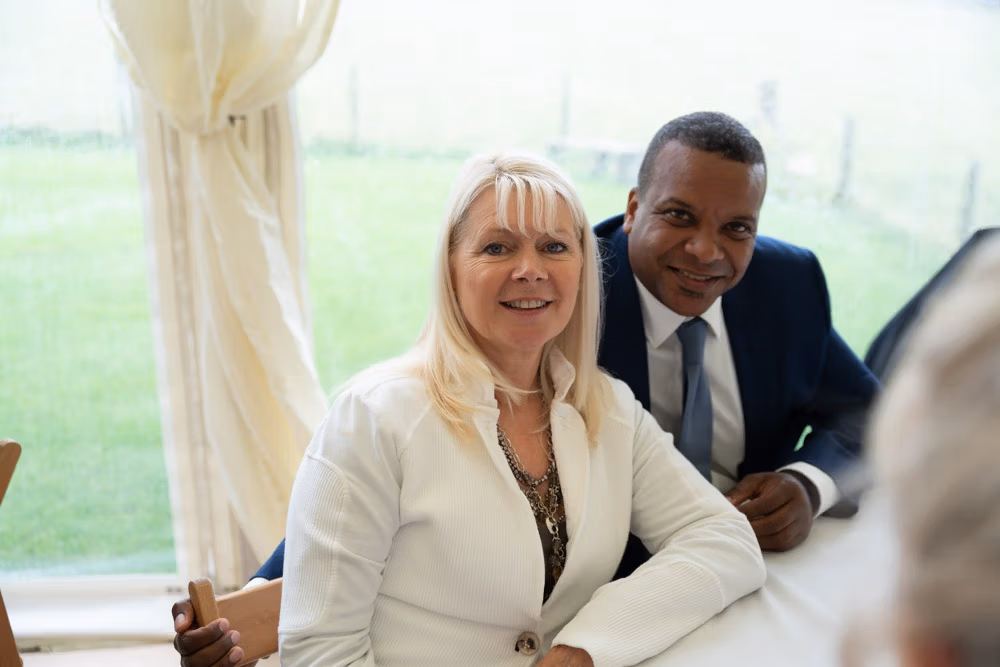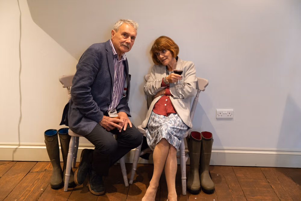 Later in the afternoon, as the rain eased, Helen pulled on her wellies and Adam steadied her hand. Together they crossed the field toward her white horse — a moment she’d been dreaming of. The horse turned its head as if posing, the couple laughed, and for a few seconds everything felt perfectly still.