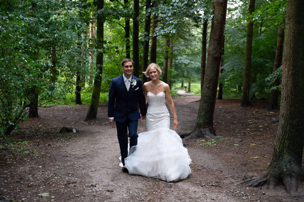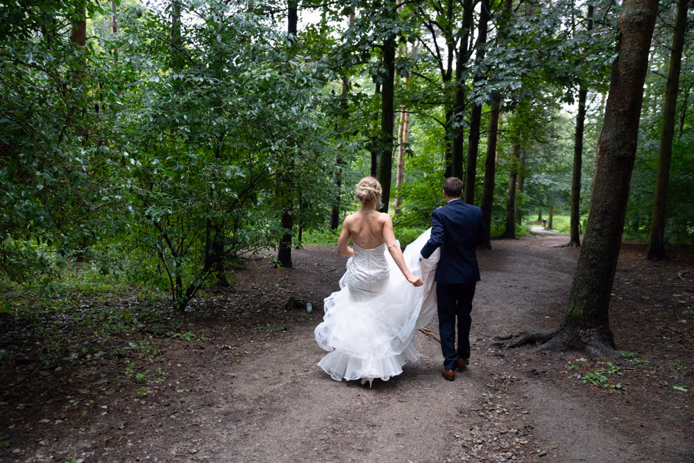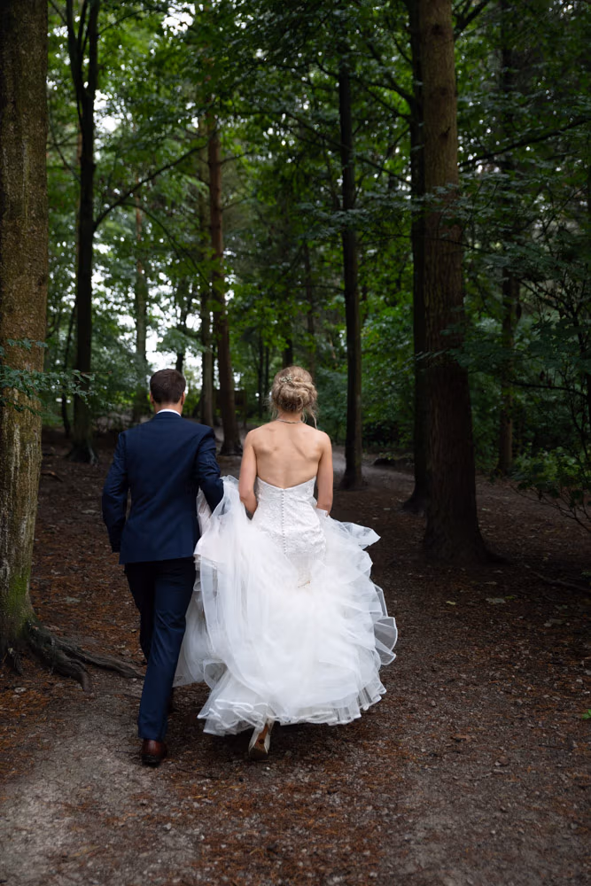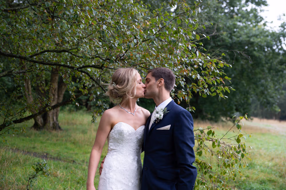 Umbrellas up, we wandered to the edge of Chevin Forest. The light softened, the greens deepened, and Helen and Adam shared a quiet kiss beneath the trees — their dog close behind. Rain-washed, real, and beautifully unposed — just as wedding days should be.