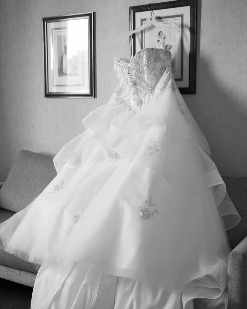These sparkly pink heels rested near the dress as it flowed gently over the