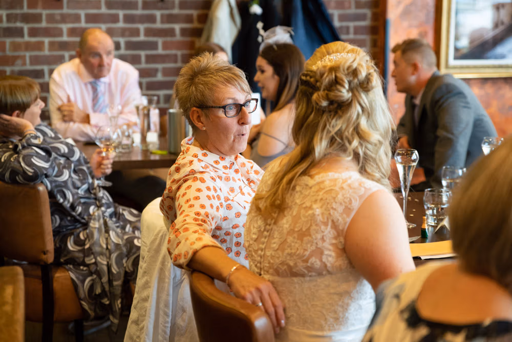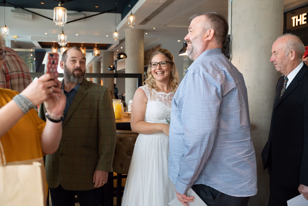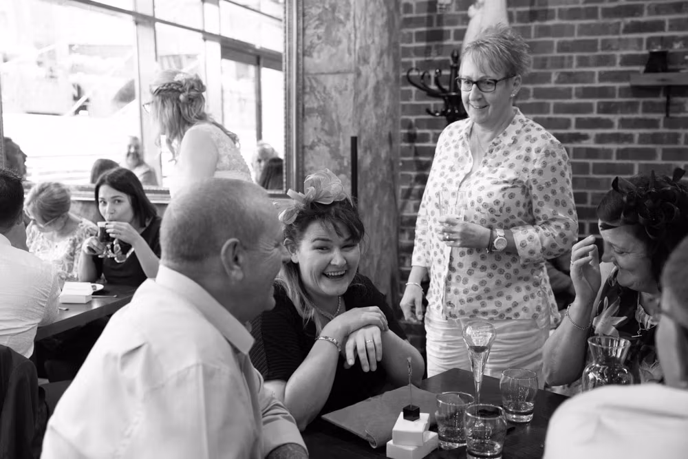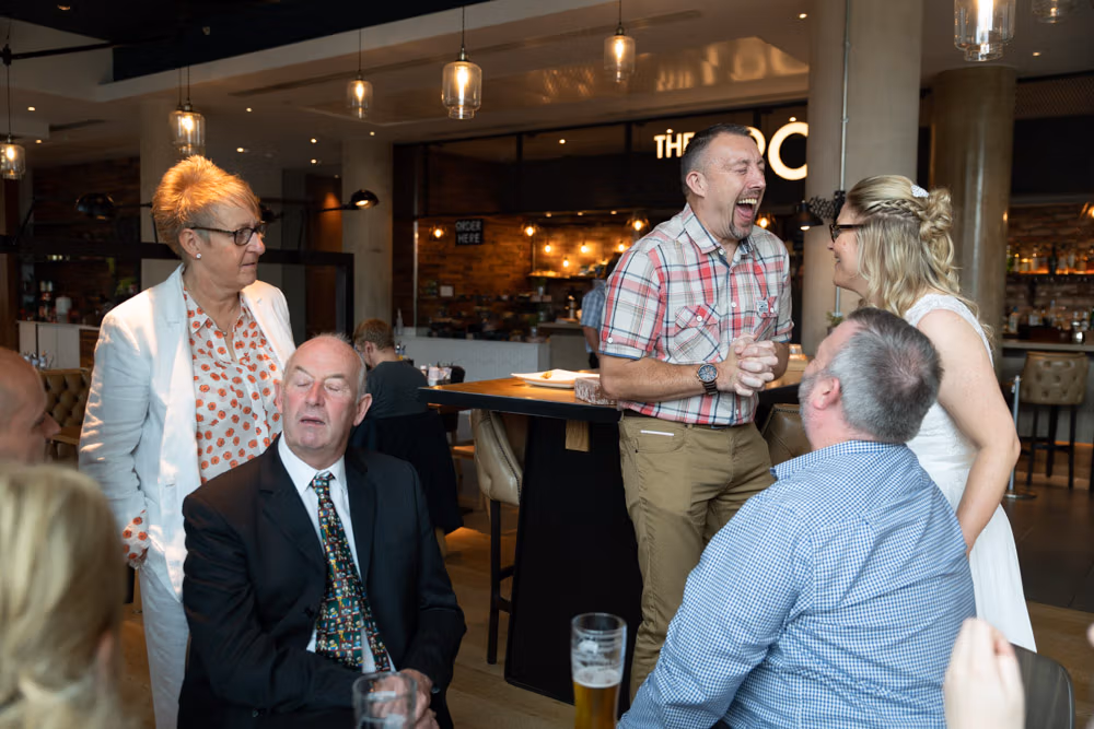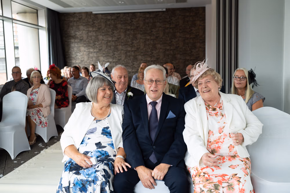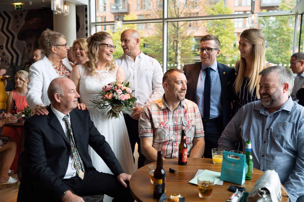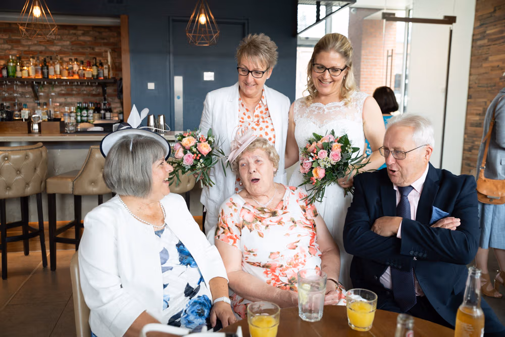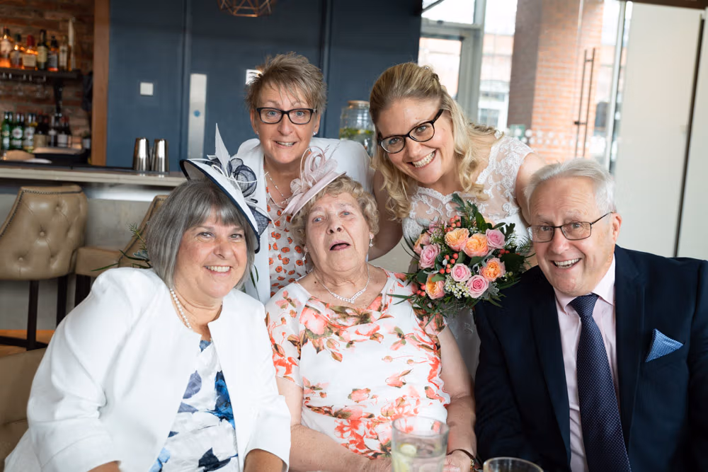 As the evening settled, the guestbook made its way from table to table while small moments continued to unfold — friends leaning in close, quiet exchanges, laughter passing easily between people. Later, as the light dipped over Leeds, a few relaxed family photographs were taken outside, everyone glowing softly as the day edged into night.