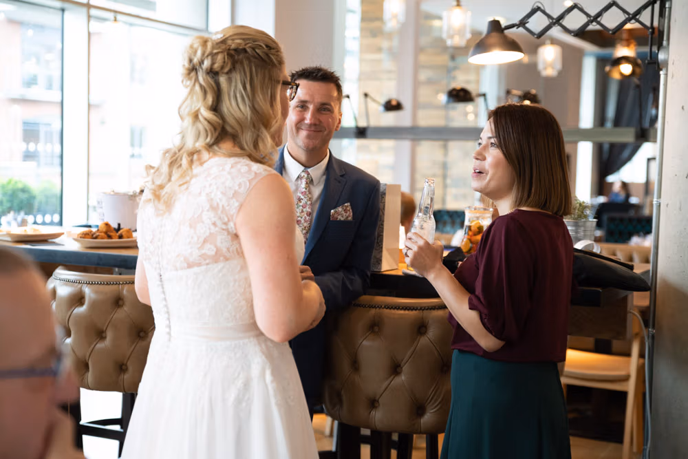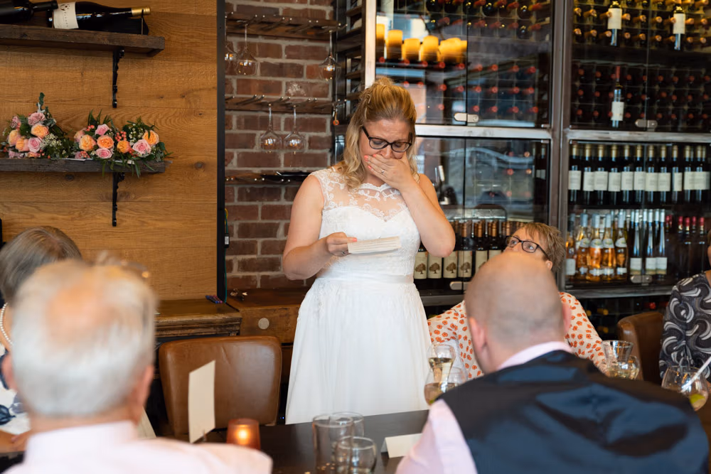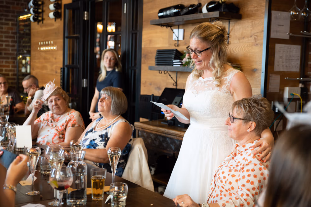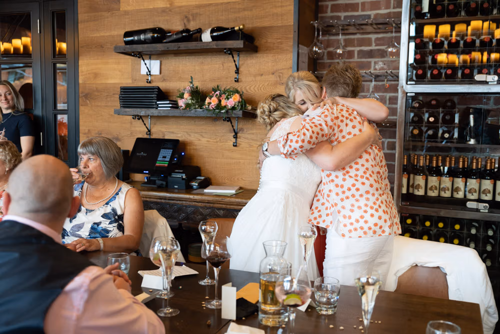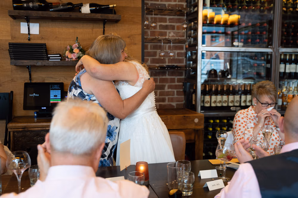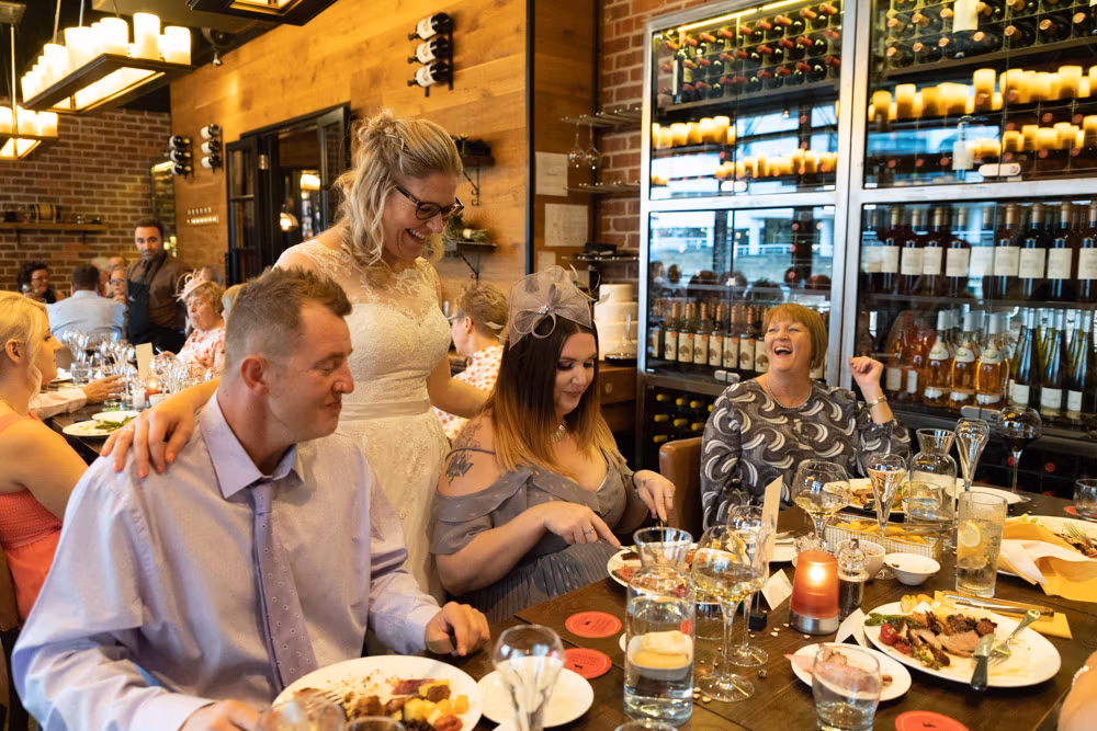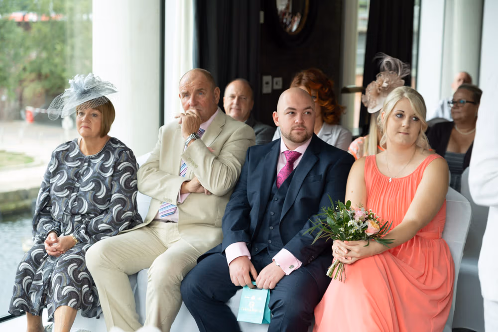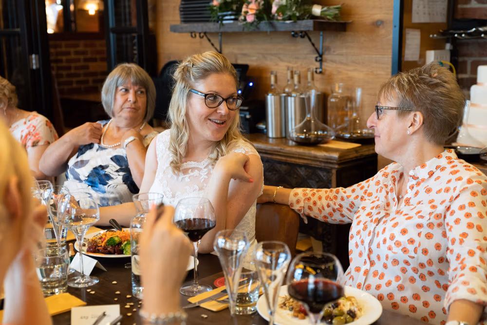 As the evening settled, the guestbook made its way from table to table while small moments continued to unfold — friends leaning in close, quiet exchanges, laughter passing easily between people. Later, as the light dipped over Leeds, a few relaxed family photographs were taken outside, everyone glowing softly as the day edged into night.
