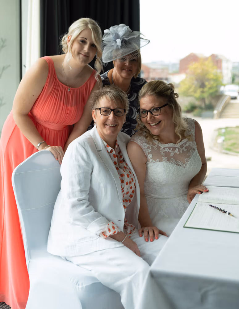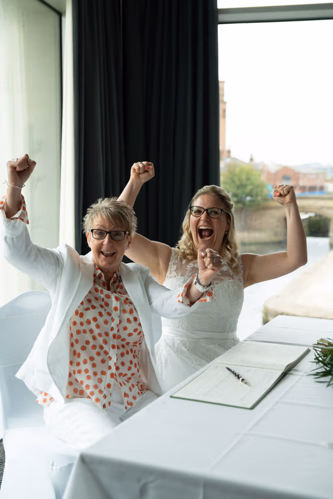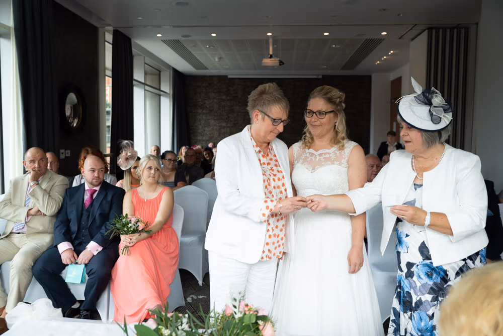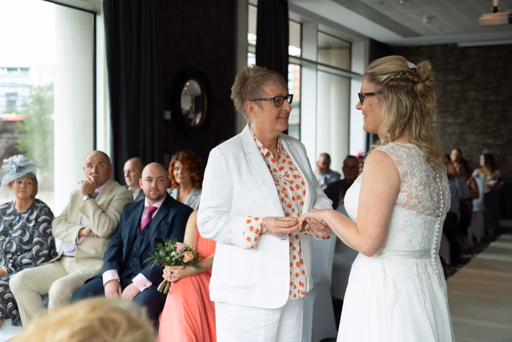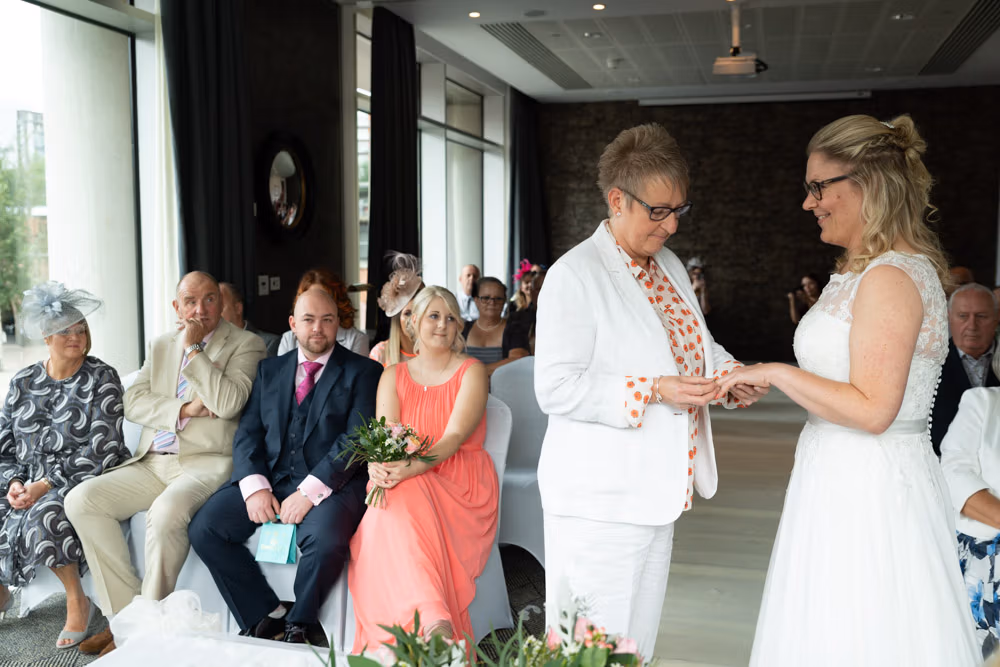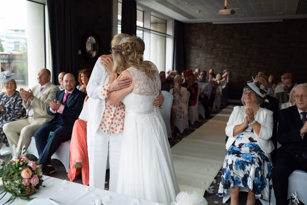 When Clare and Tracey entered, the focus shifted instantly. Emotion showed most clearly in Tracey’s daughter’s eyes — proud, moved, and watching every moment closely. Rings were exchanged, a joyful first kiss followed, and the signing of the register came with wide smiles and arms lifted high.