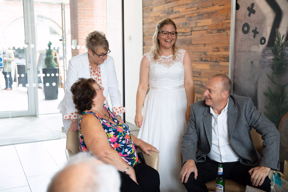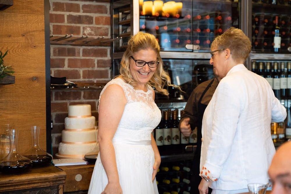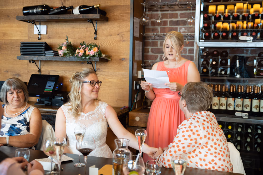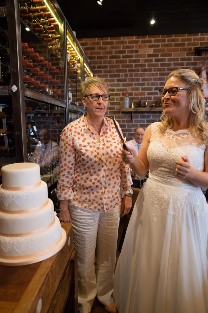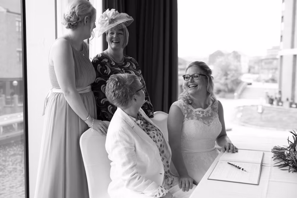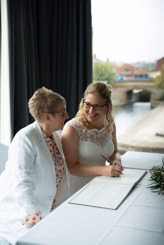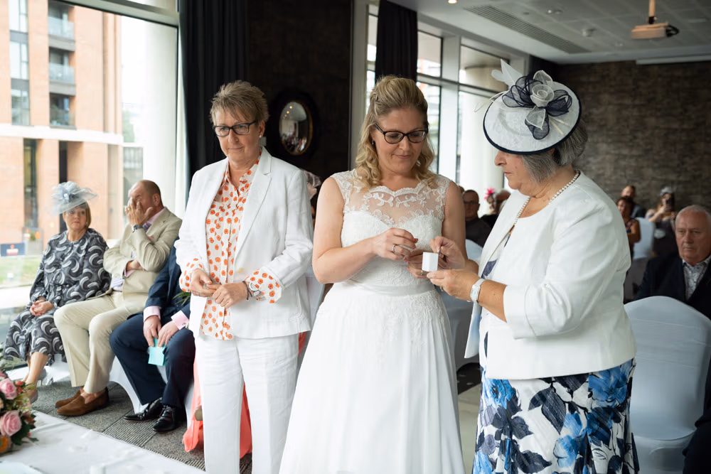 When Clare and Tracey entered, the focus shifted instantly. Emotion showed most clearly in Tracey’s daughter’s eyes — proud, moved, and watching every moment closely. Rings were exchanged, a joyful first kiss followed, and the signing of the register came with wide smiles and arms lifted high.