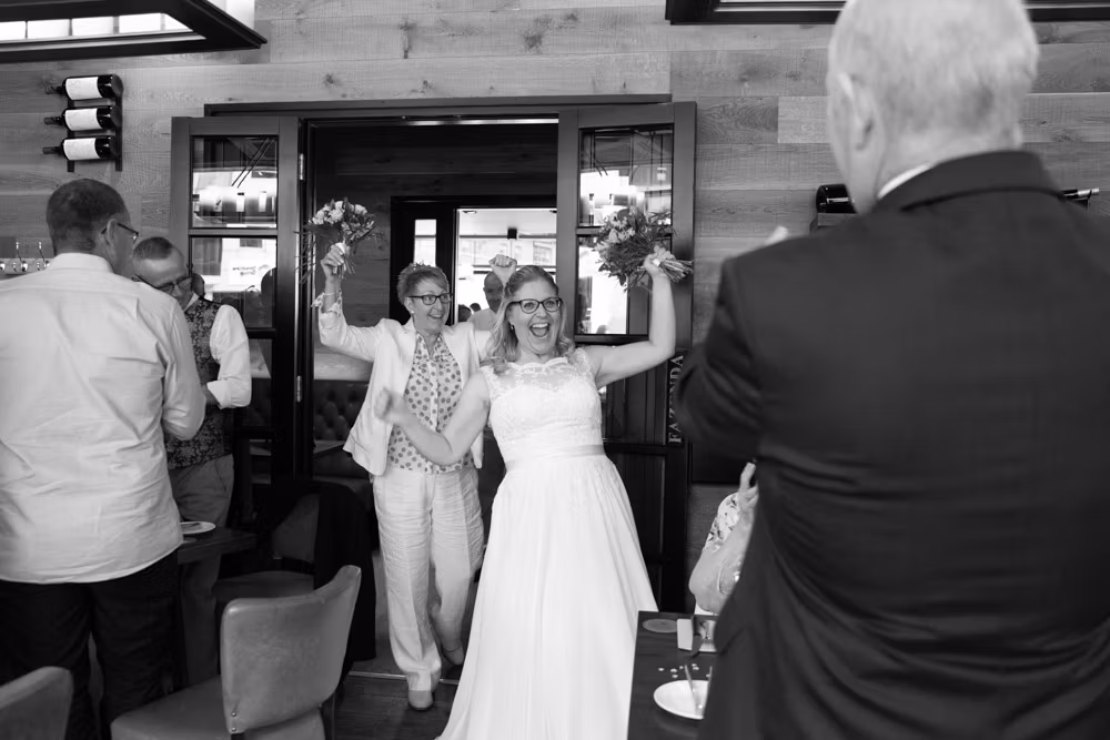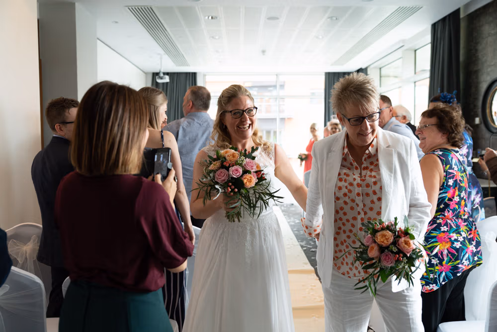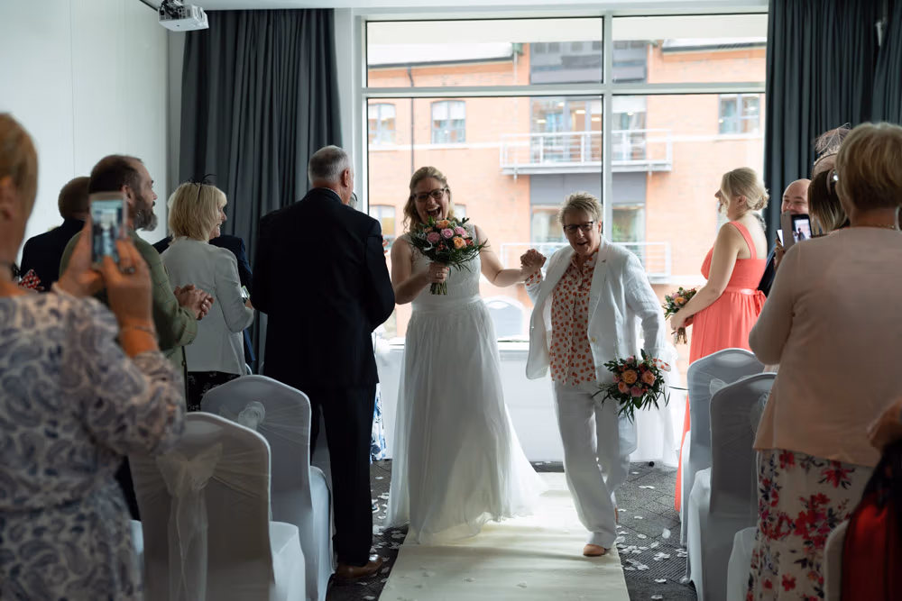 Clare and Tracey smiled all the way down the aisle, excitement radiating from every glance. Guests cheered and I captured the natural joy as the ceremony transitioned from anticipation to celebration.