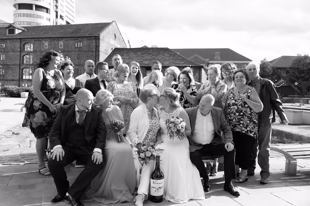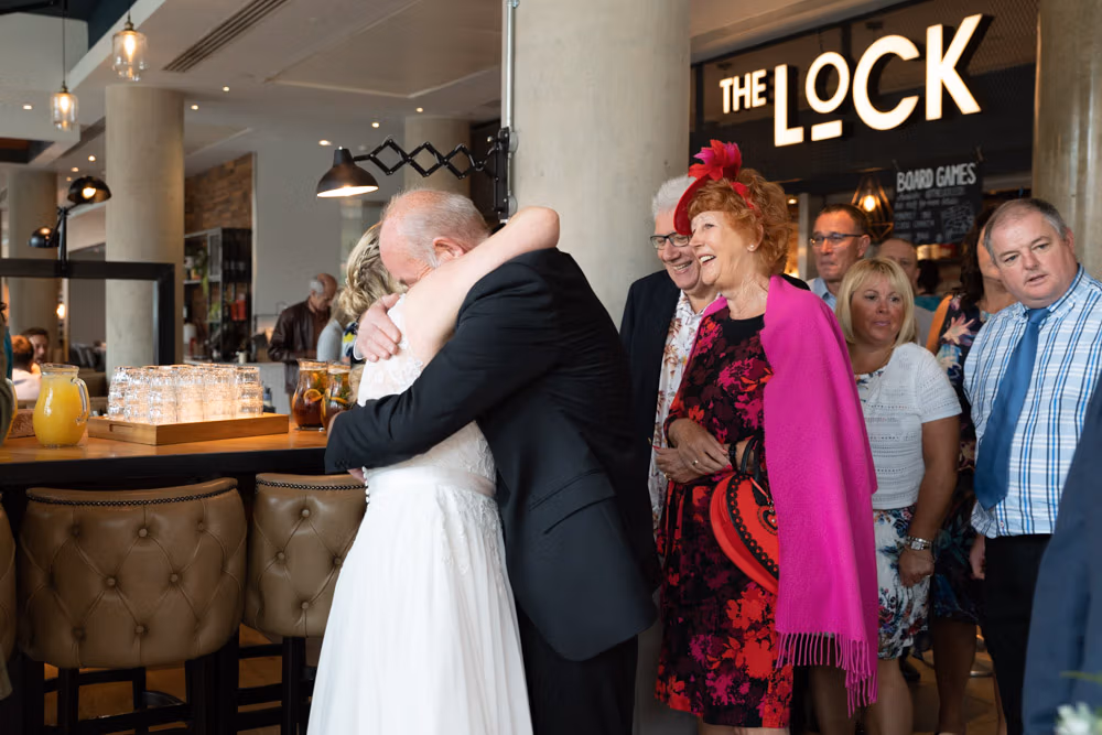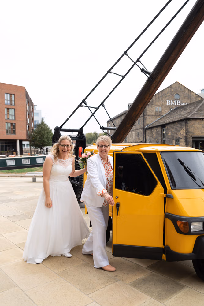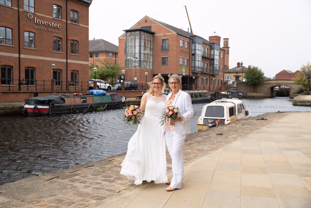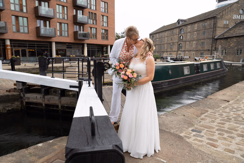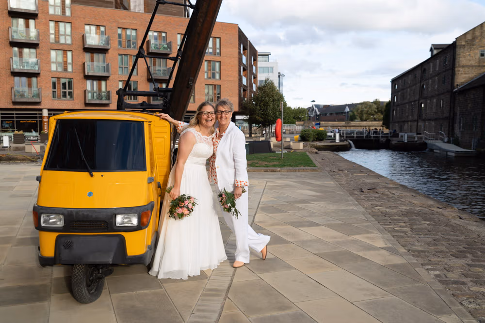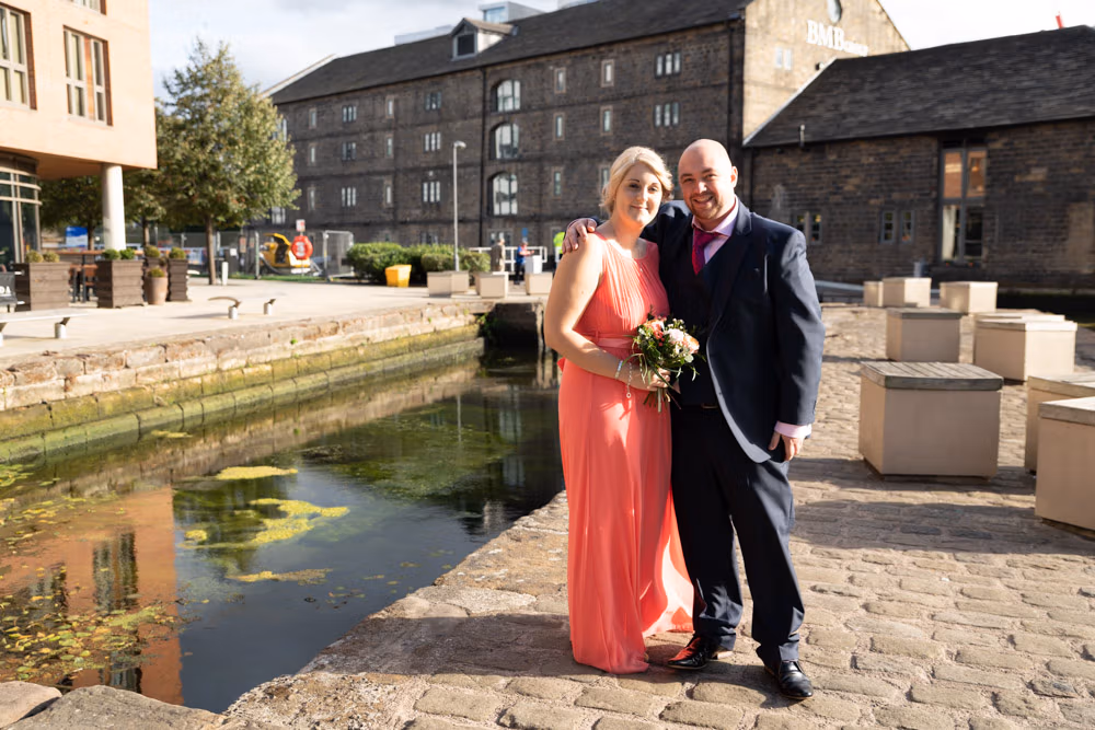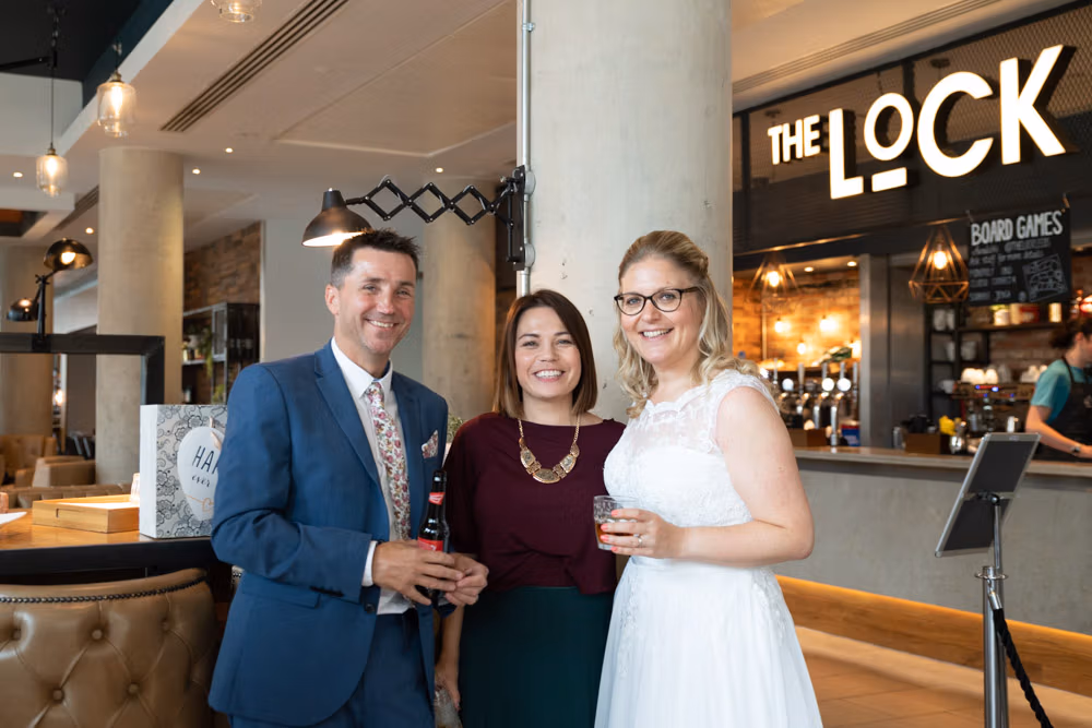 The bright yellow Prosecco van offered a playful first backdrop, while Granary Wharf’s waterfront stretched out nearby, catching the light beautifully. Outside The Lock, the timber entrance and bold signage framed one last quiet portrait before the celebration moved back inside.