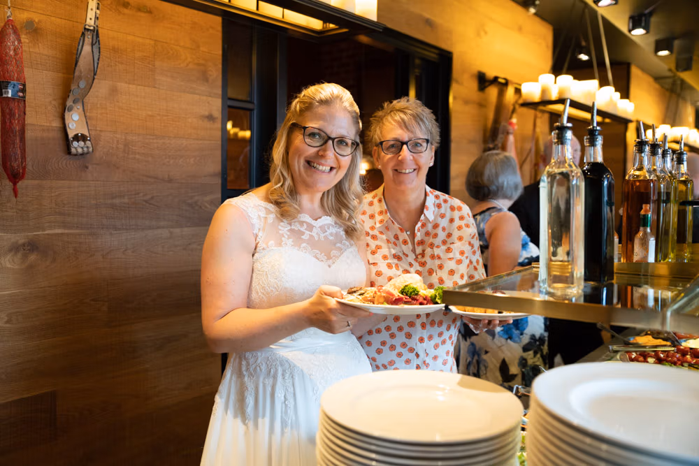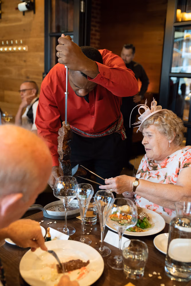 Dinner unfolded slowly and joyfully. Freshly carved meats were brought to each table, while the buffet offered an abundance of salads, sides, and vegetarian dishes. Plates were refilled, conversations stretched on, and more than a few guests happily went back for seconds — and thirds.