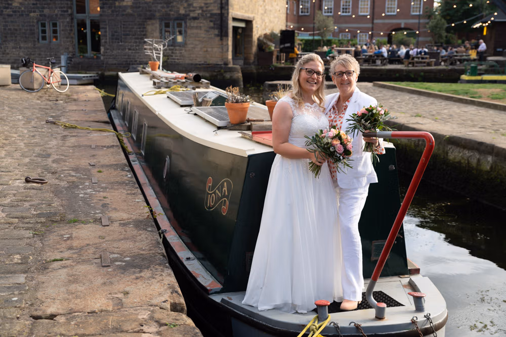 Before the evening drew to a close, there was time for one last wander by the water’s edge. A passing canal boat slowed, and its owner waved Clare and Tracey aboard for a quick photograph — one of those spontaneous gestures that seem to appear when the atmosphere is just right.