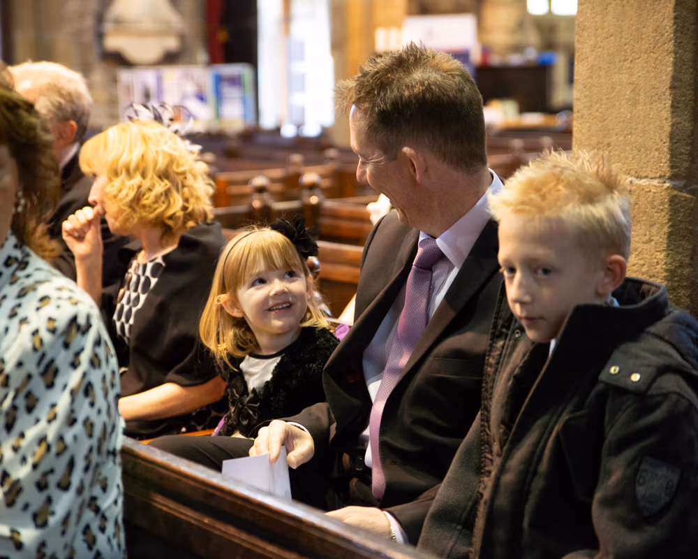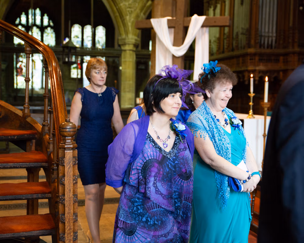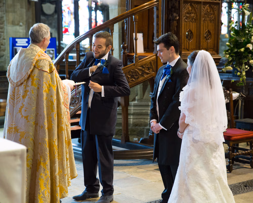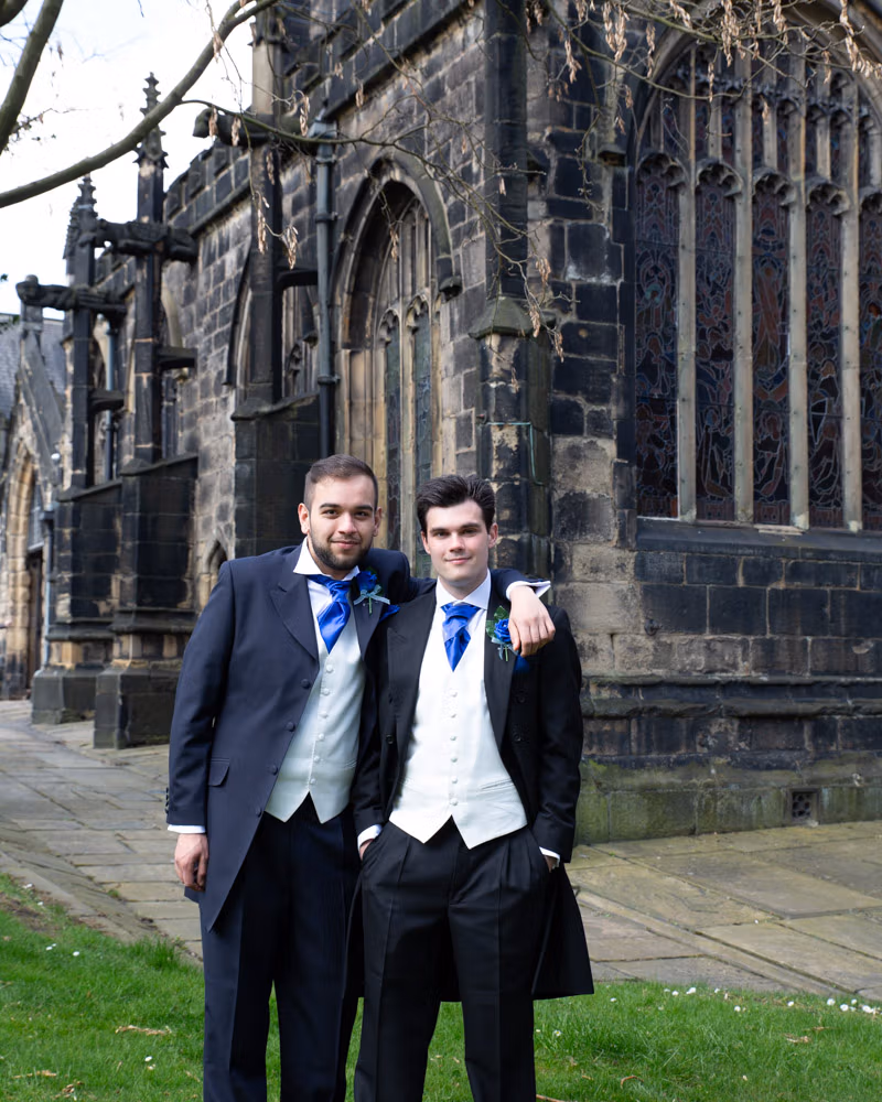 Inside Halifax Minster, the light filtered through the stained glass as guests took their seats. The groom and best man waited quietly, sharing a moment before the arrival of the bride.