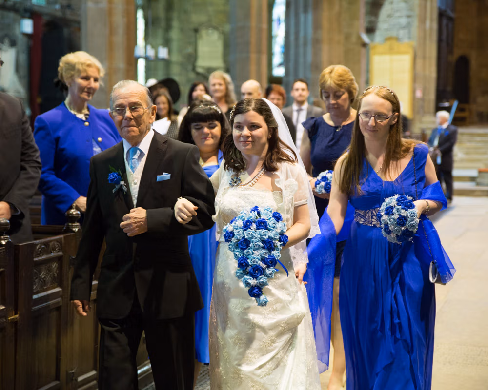 Her dad walked proudly beside her, and the love between them was obvious. From behind the camera, I already knew this would be one of the most memorable weddings I’d ever photograph — right here in the heart of Halifax, not far from my base in Leeds.