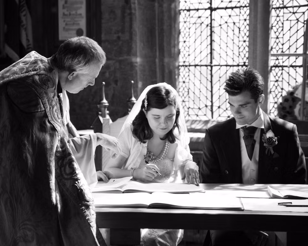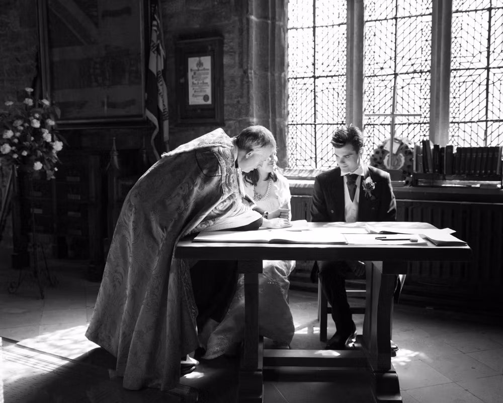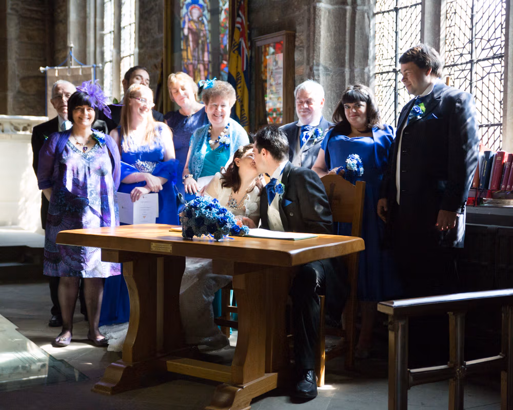 After the ceremony, we made our way quietly into the vestry — a beautiful space bathed in soft window light. There was such joy in the air. The newlyweds shared a smile as they signed the register, framed by the stained glass and the grandeur of Halifax Minster’s old stone walls.