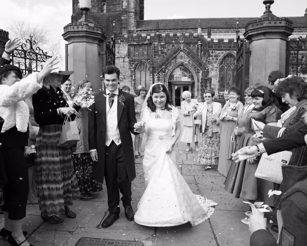 Outside the Minster, the guests formed two lines, smiling and cheering as Claire and Tom stepped out hand in hand. The confetti flew, the sunlight returned, and at the end of the walk, Claire let out the most joyful expression — a moment I’ll never forget. A kiss sealed the walk and the laughter echoed around the church grounds.