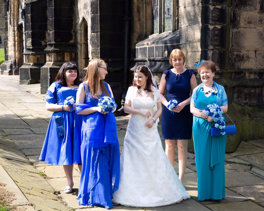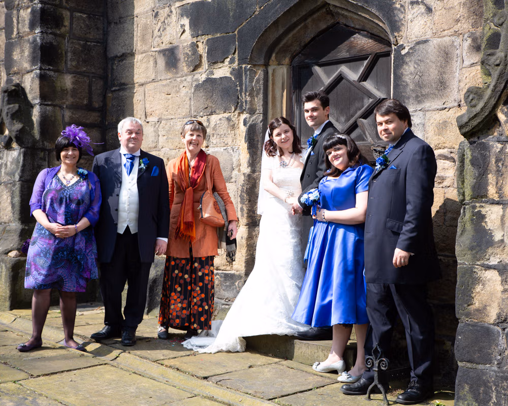We gathered for a few relaxed group photos in the April sun. The groom with his best man and both fathers. Claire with her bridesmaids, her mum, and Tom’s — all glowing against the beautiful Halifax Minster stone. One wide shot of the full wedding party caught everyone mid-laughter, a perfect memory. Then just a few more before slipping away for some quiet portraits of the couple beside the old side door — soft sunlight, shadows, and real tenderness.