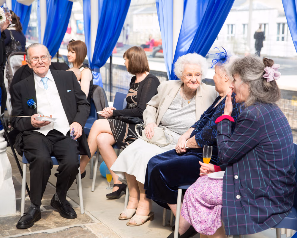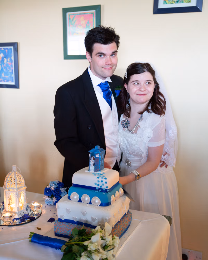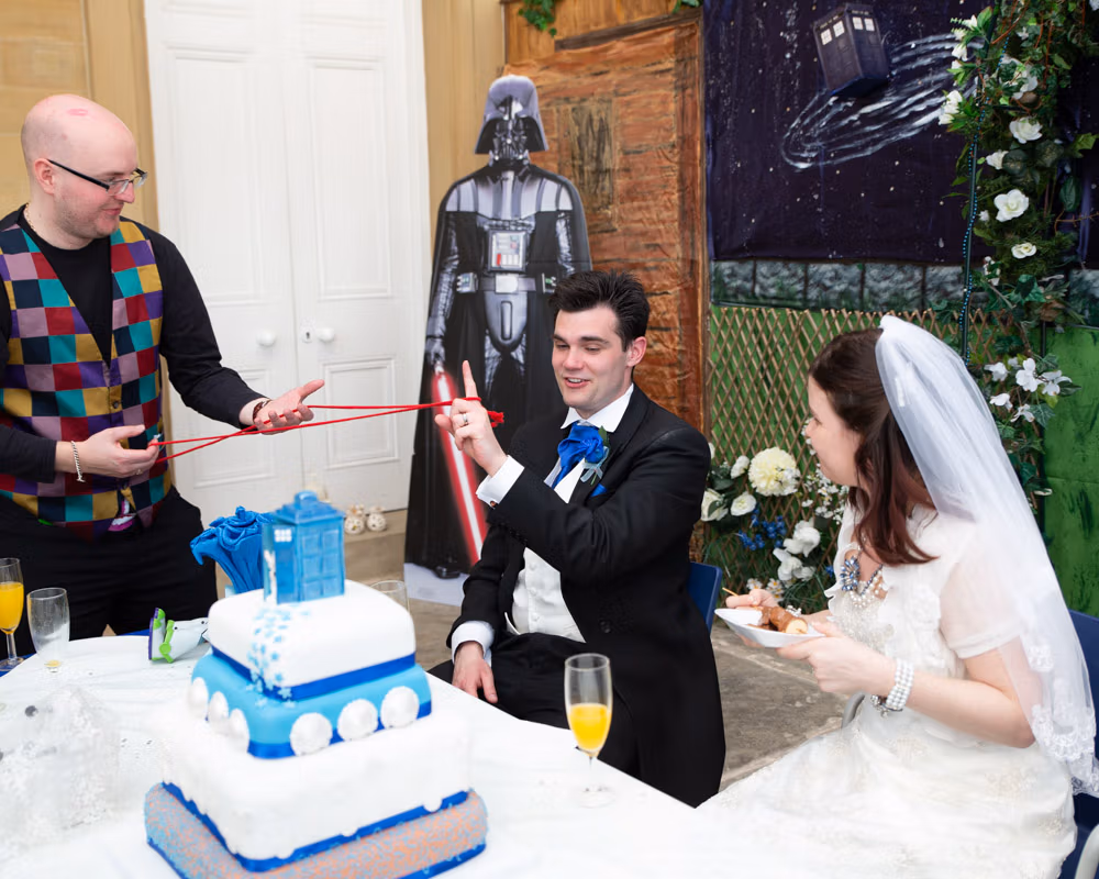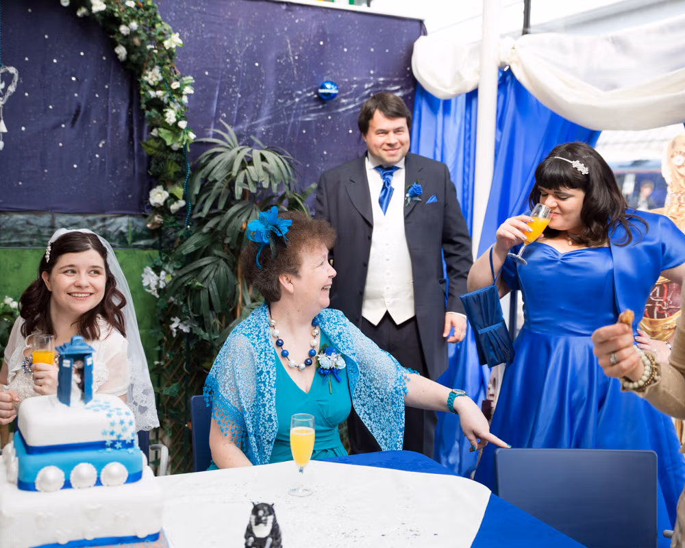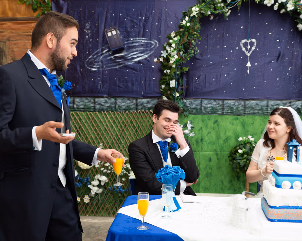 Inside the Northern Broadsides Theatre Company, the celebration truly came into its own. Blue details echoed the day — tablecloths, bouquets, dresses, even the Dr Who TARDIS card box and a mini one perched proudly atop the cake. A chocolate fountain and snack station kept everyone fuelled between laughter and speeches.