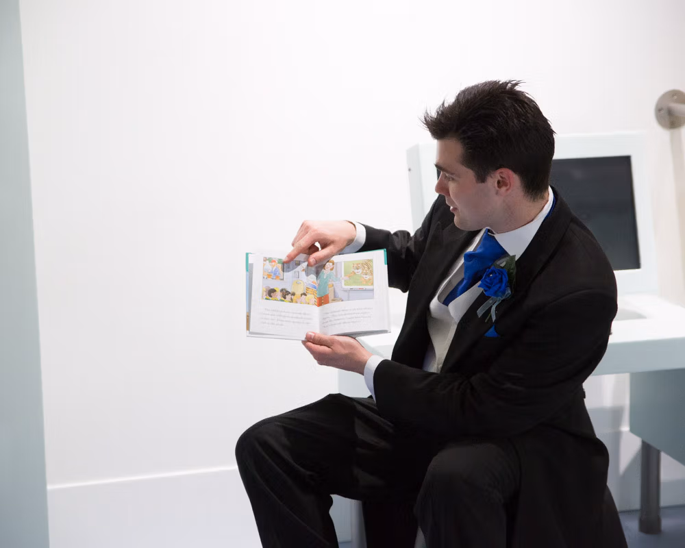 As a photographer, it was a dream. The oversized mouth, the dentist chair, the body scanner — all perfect backdrops for playful, one-of-a-kind portraits. I captured the bouquet resting gently against her dress; the groom reading a story to Claire and her mum; her sister lying on the giant tongue — and later, the bride and groom inside the enormous nostrils, laughing like kids.
