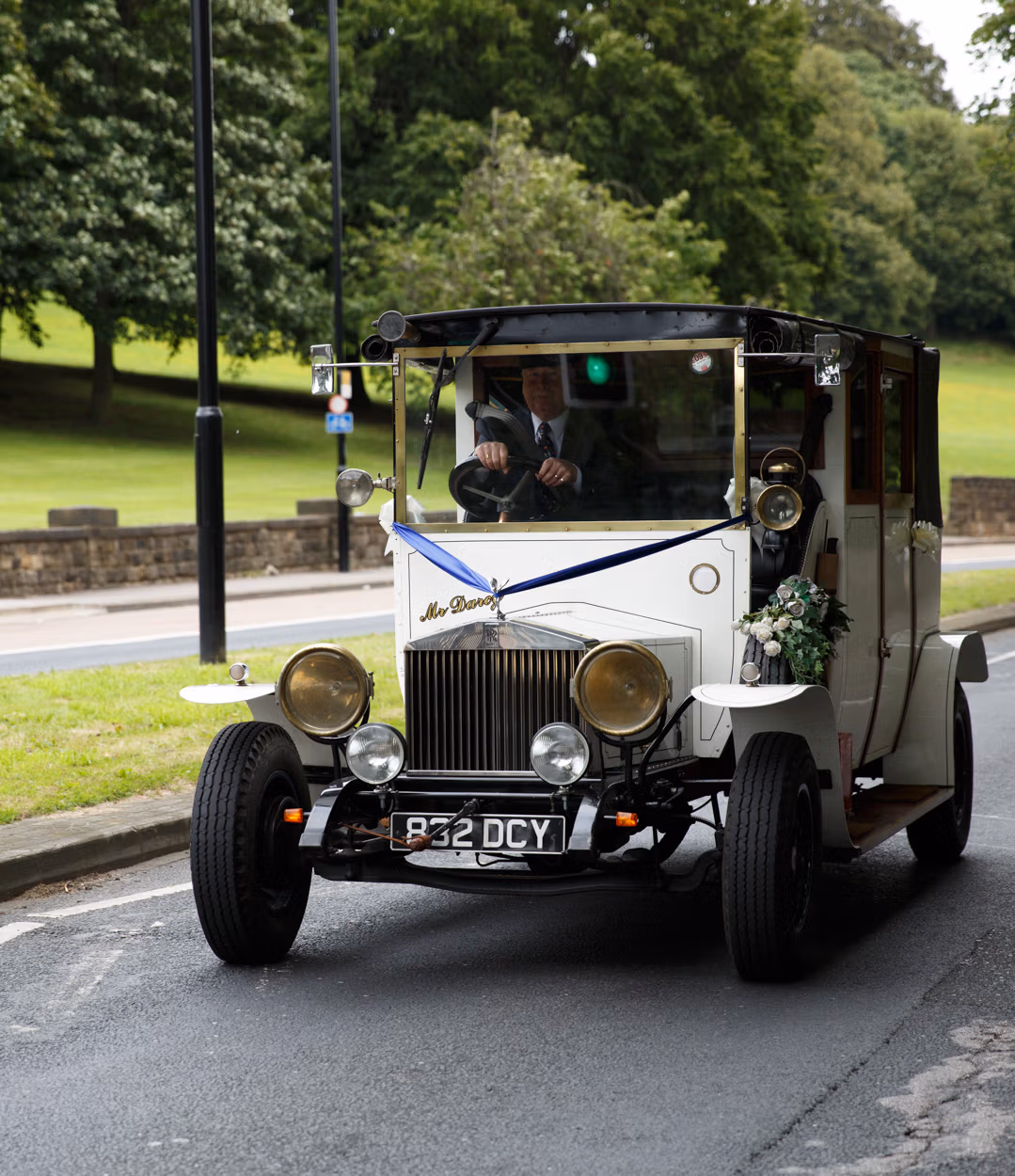 Before Linsey and her bridesmaids arrived, I’d already photographed over a hundred moments — guests gathering, details unfolding, anticipation building. Linsey arrived in a vintage car affectionately named Mr Darcy, its interior almost perfectly echoing the rich purple tones of her dress. She described herself as a little camera-shy, but experience teaches you how to work gently and intuitively in moments like that — allowing things to unfold naturally rather than forcing them.