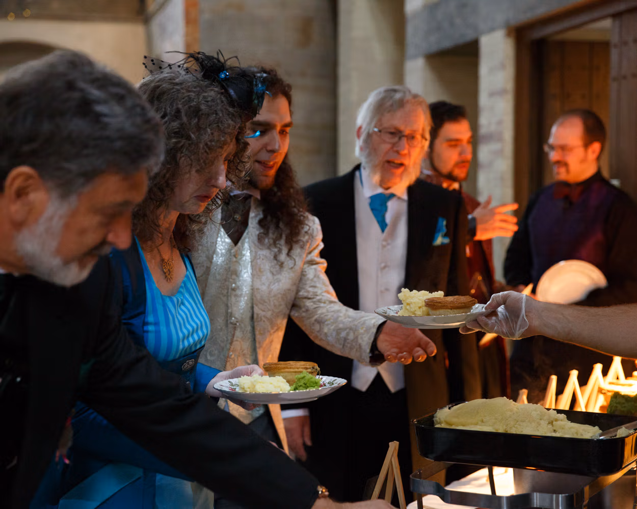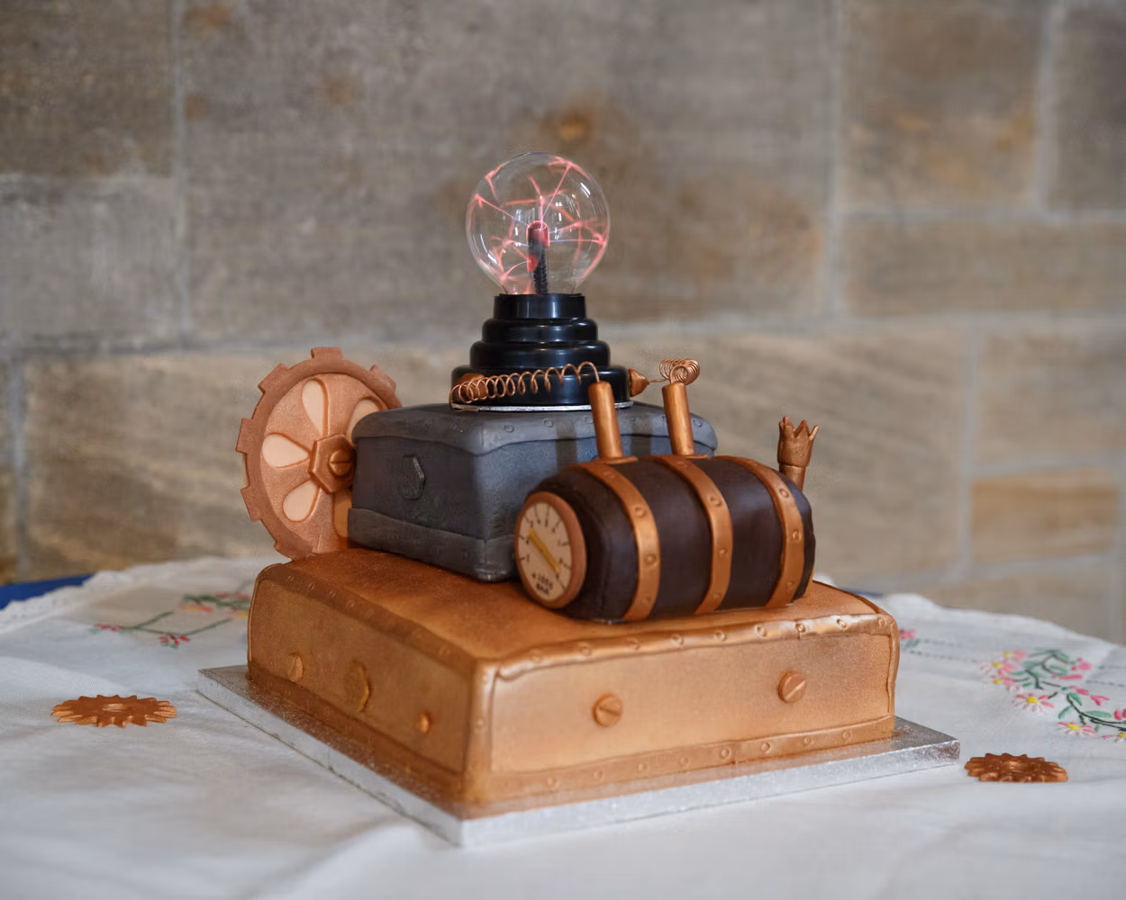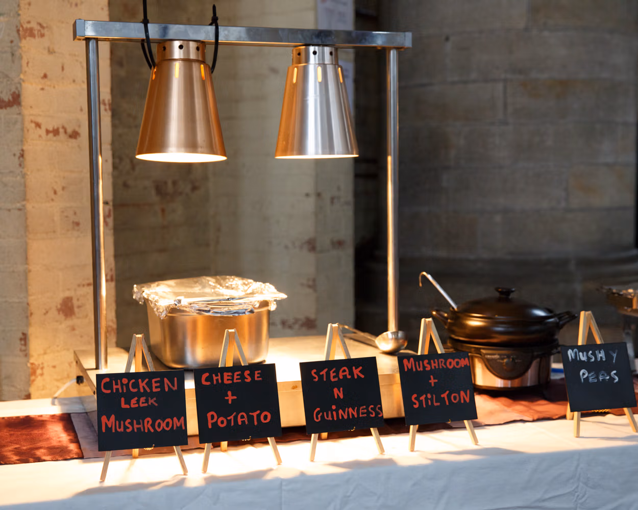 After drinks in the Kirkstall Abbey café, everyone boarded the wedding bus and travelled together to Left Bank Leeds. The shift in atmosphere was immediate. Tall ceilings amplified the space, long tables filled quickly, and the personality of the day revealed itself in layers — pie, mash, and gravy; a vintage photo-booth setup; a power-generator wedding cake; even an aeroplane suspended from the ceiling. Each detail added to the sense of fun without ever feeling staged.