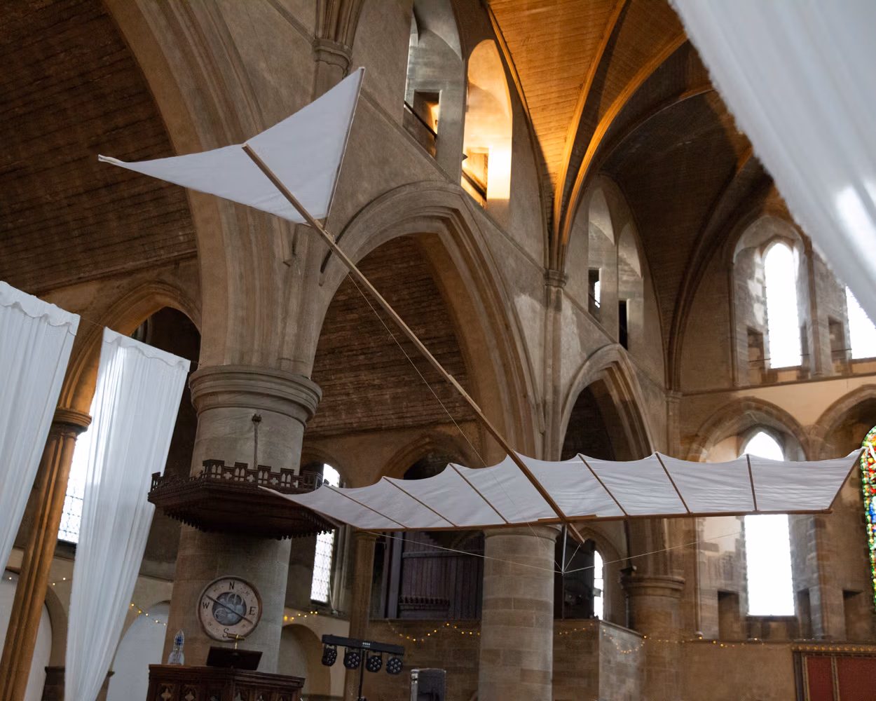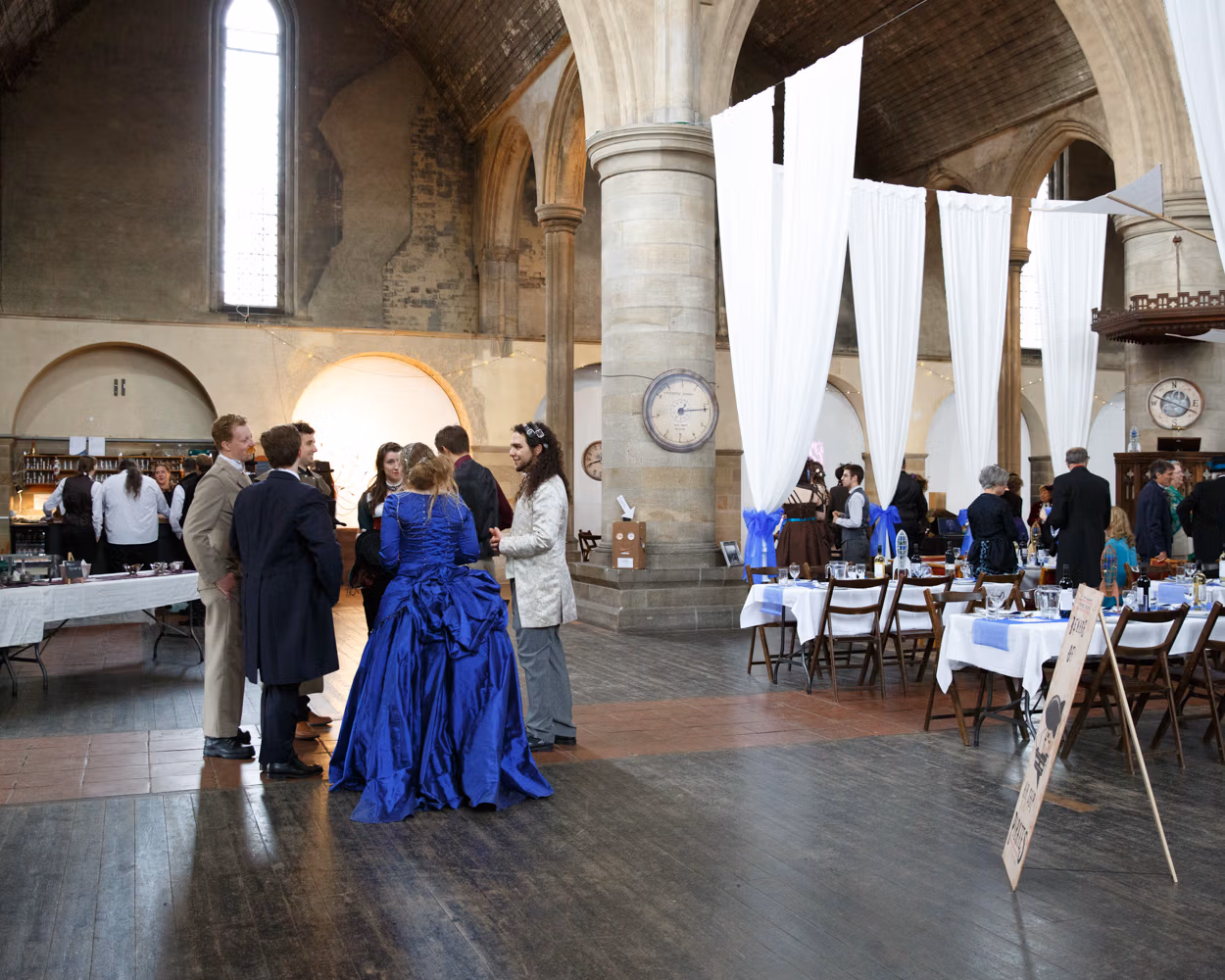 stone architecture and long ceremonial aisle. Left Bank Leeds, a restored Grade