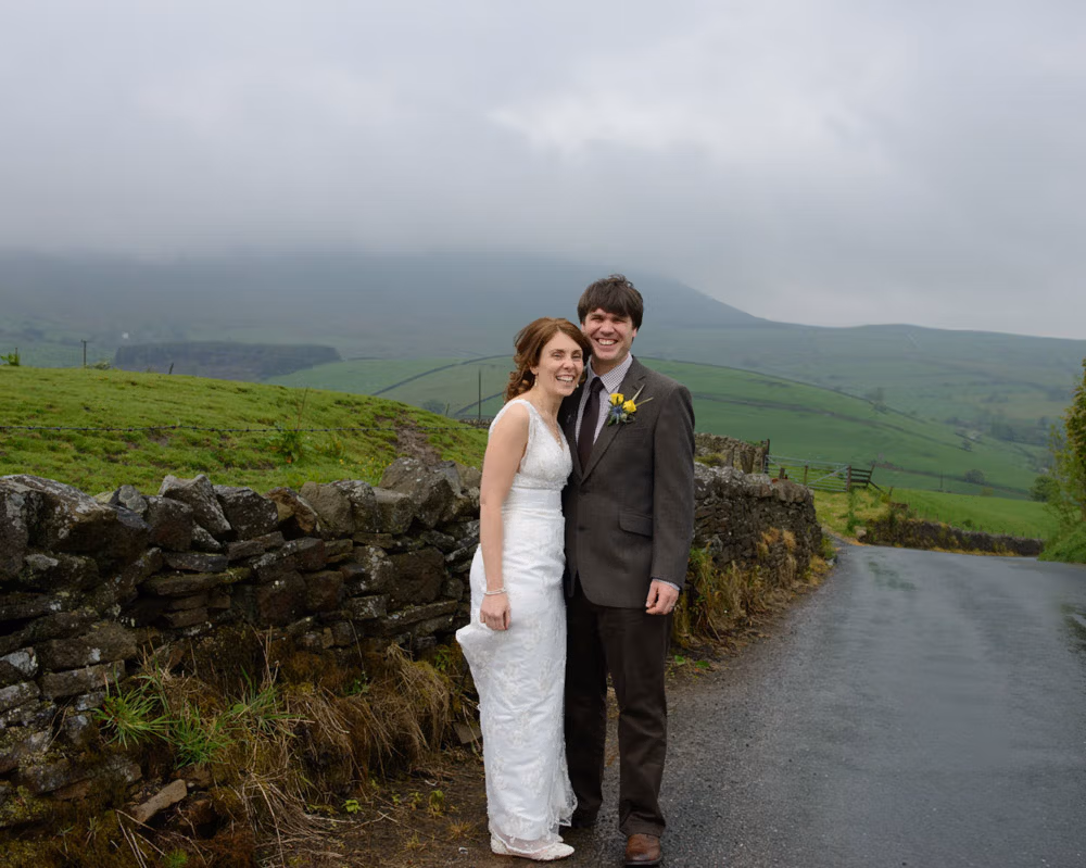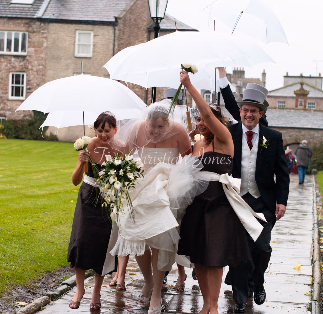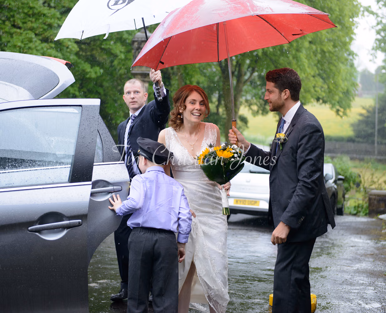 After the church ceremony, rain rolled across Pendle Hill as we arrived at Barley Village Hall. The plan had always been to step out for portraits, but the weather made the couple pause. We slowed things down, talked it through, and decided to stick with it. With a groomsman holding umbrellas and plenty of laughter in between, the photographs became about the experience as much as the view. The rain stayed — and so did the moments that mattered.