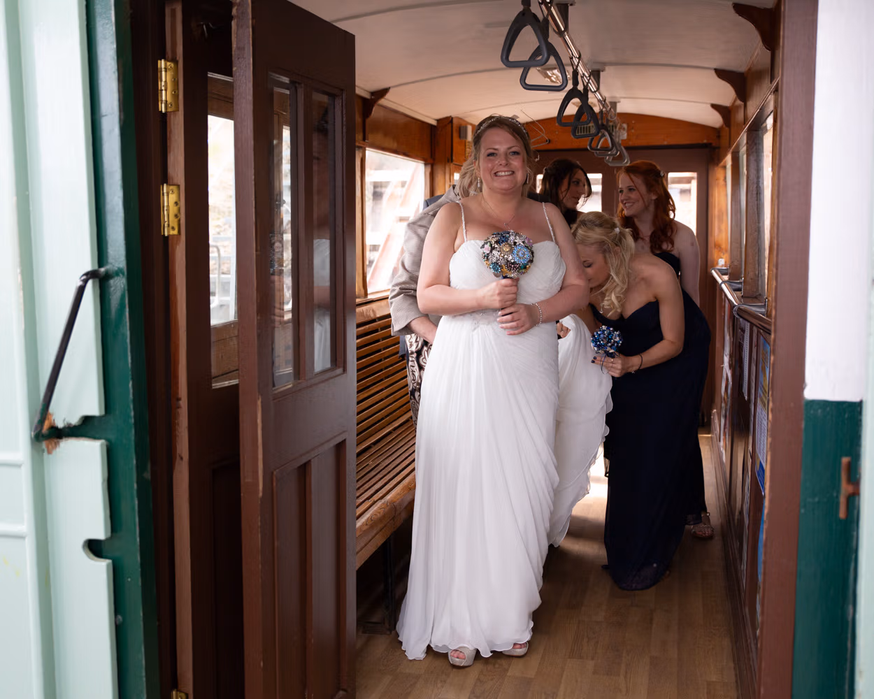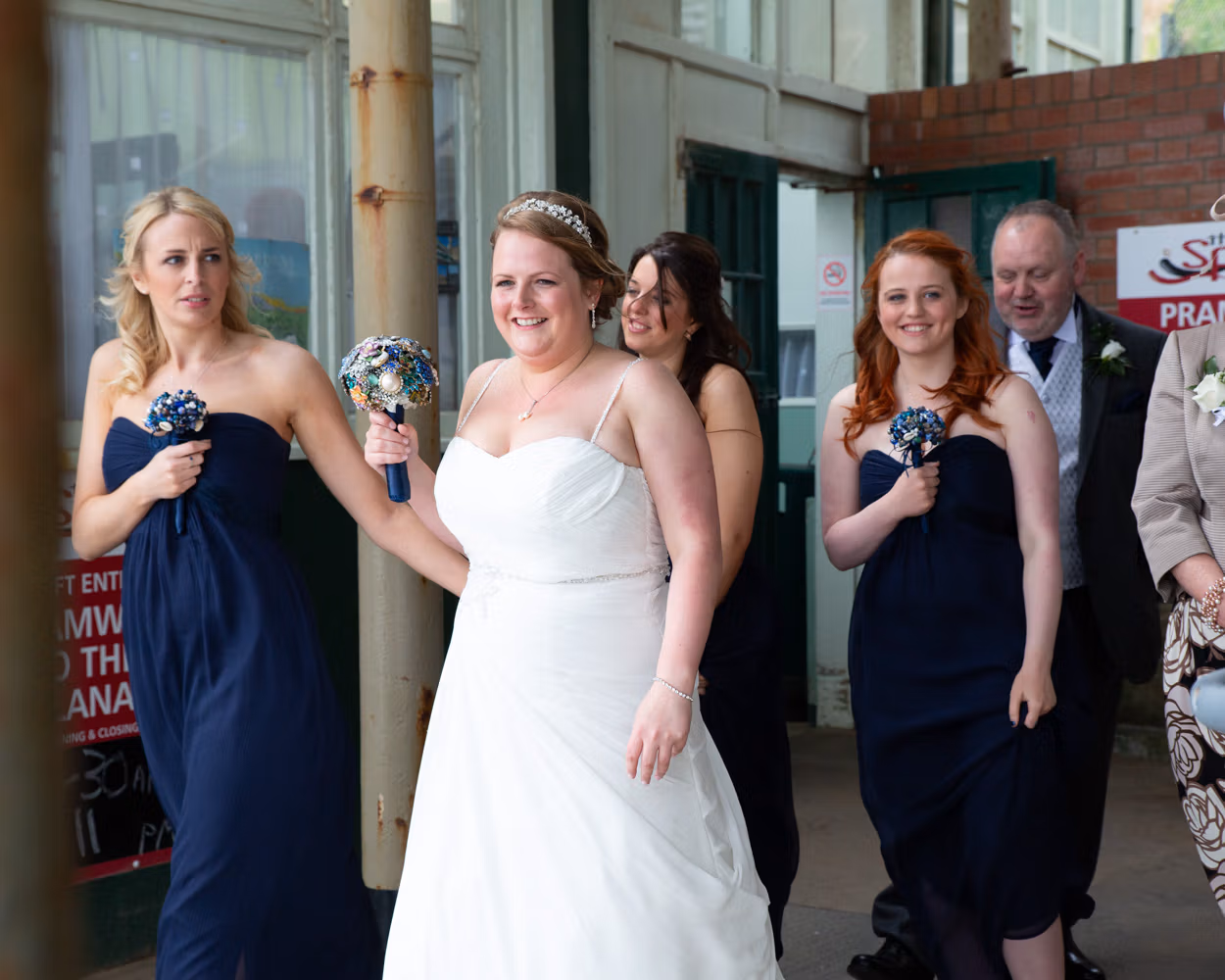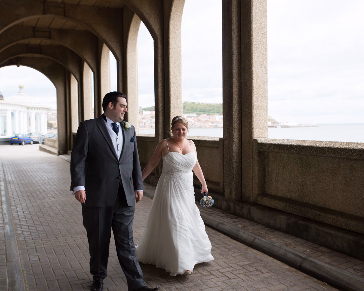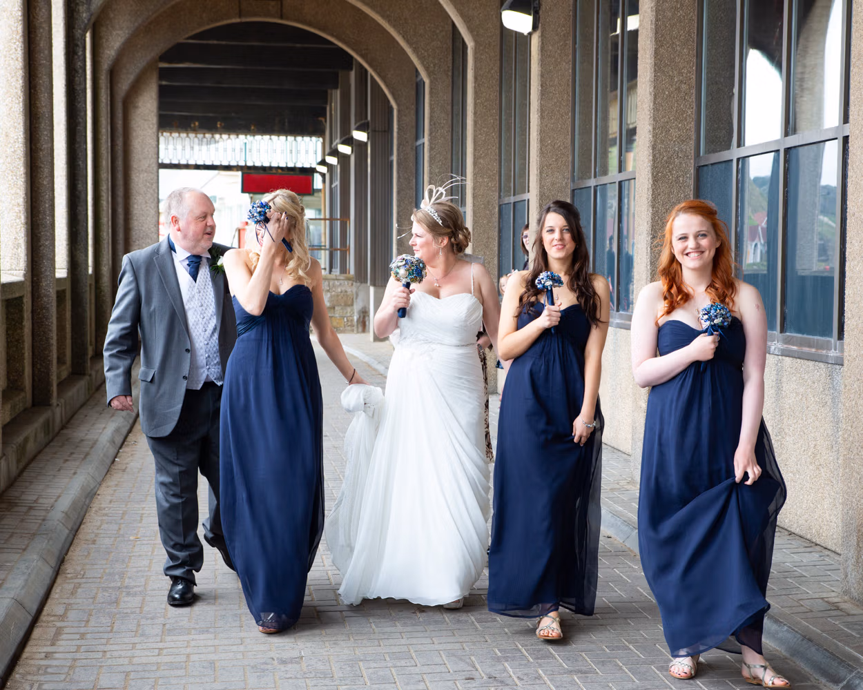 Lisa arrived with her bridesmaids and parents on the promenade, walking together toward Scarborough Spa as the wind lifted dresses and carried laughter along the seafront. They passed through the tunnel beneath the cliffs — that familiar Scarborough moment where the light drops briefly before opening out again.