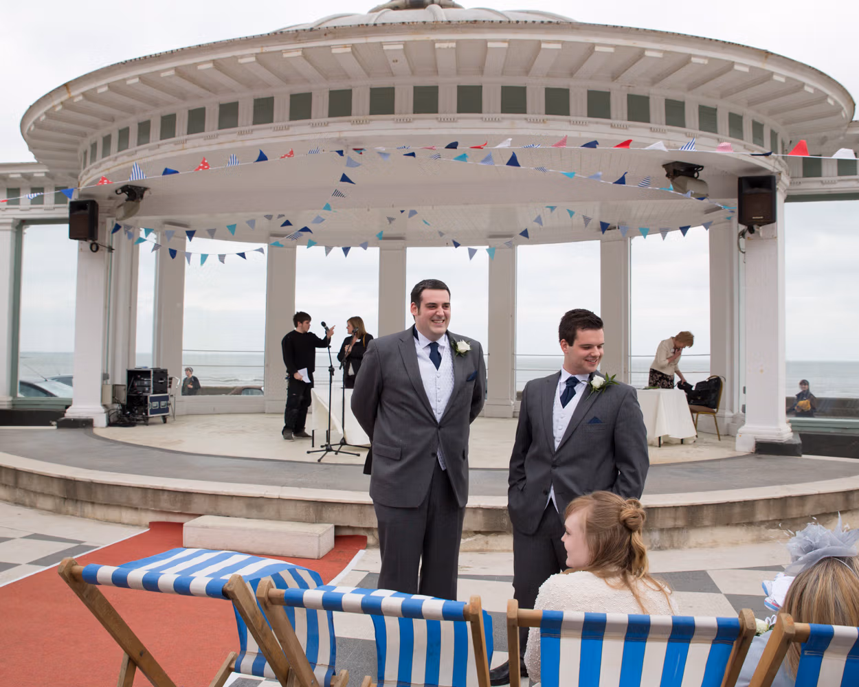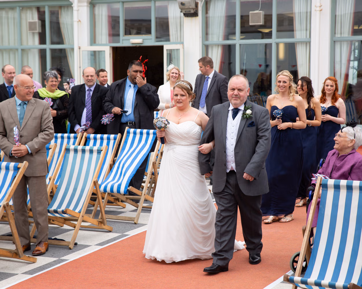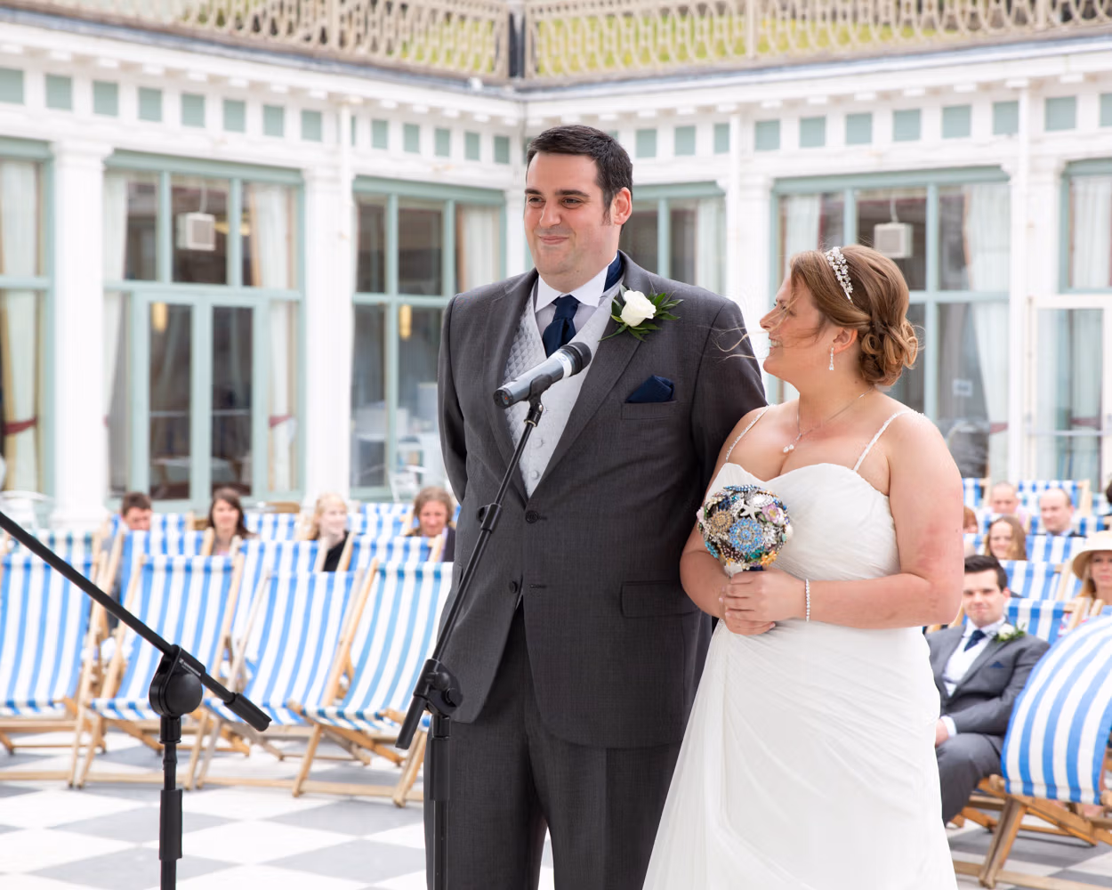 The ceremony took place outdoors, framed by the Victorian grandeur of Scarborough Spa and the steep hillside rising behind them. Guests sat in deckchairs, wrapped in sea air and anticipation, the setting feeling timeless and unmistakably seaside.