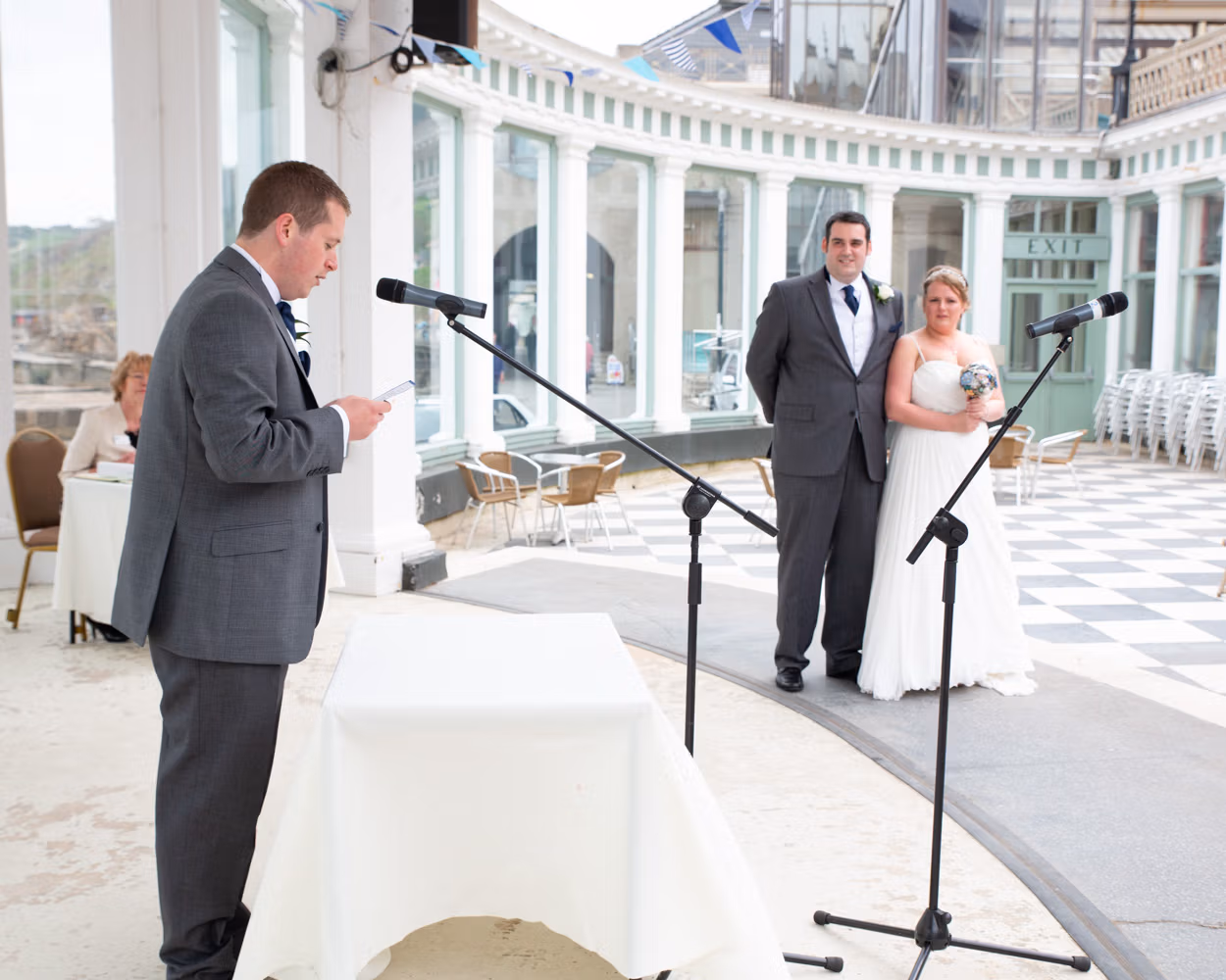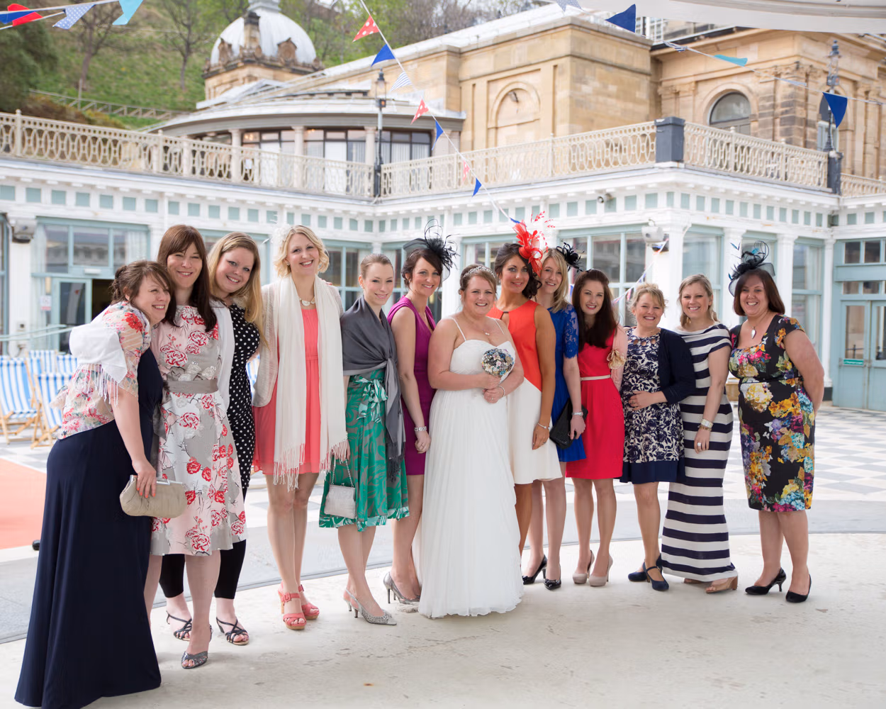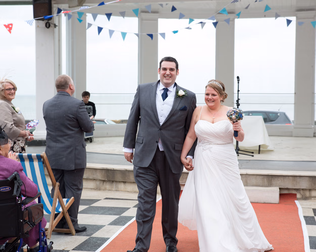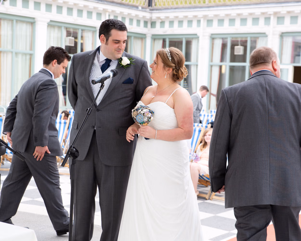 The ceremony took place outdoors, framed by the Victorian grandeur of Scarborough Spa and the steep hillside rising behind them. Guests sat in deckchairs, wrapped in sea air and anticipation, the setting feeling timeless and unmistakably seaside.