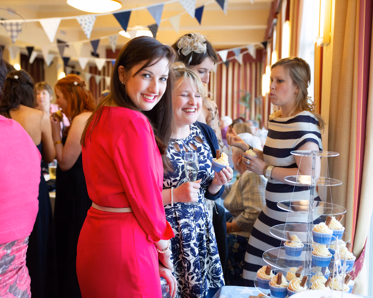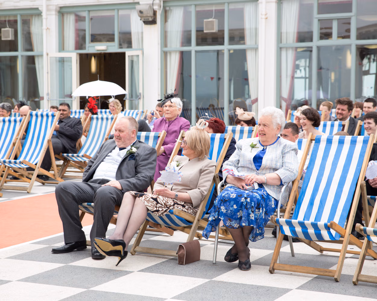 Outside, blue and white striped deckchairs shifted and fluttered in the breeze, the weather teasing but never quite committing. Guests gathered slowly, a few umbrellas appearing as light spits of rain drifted through.