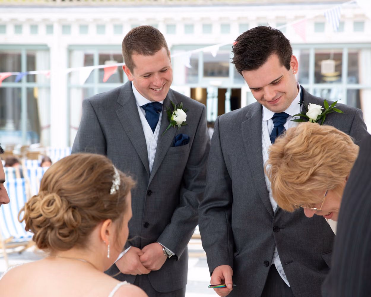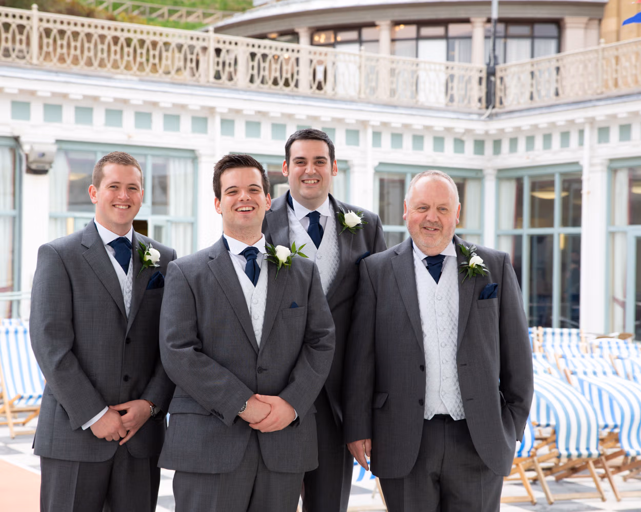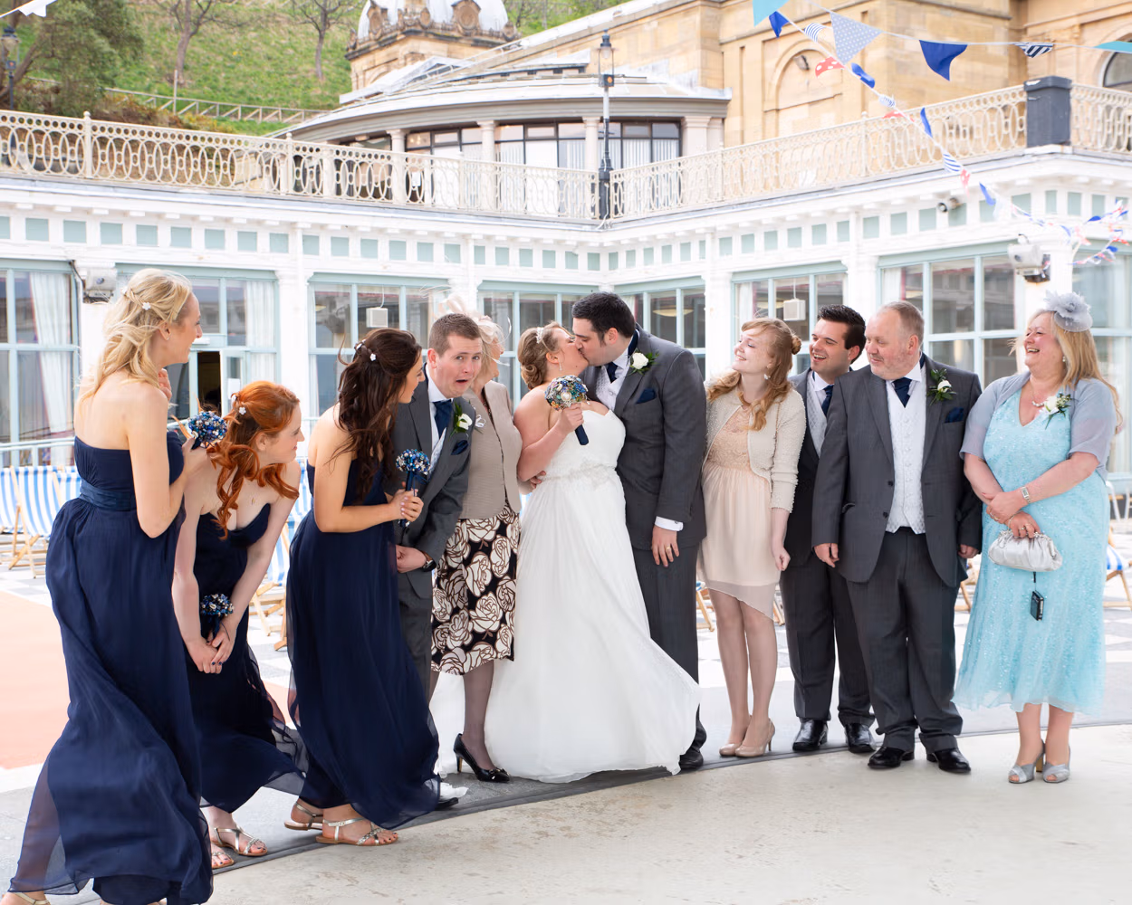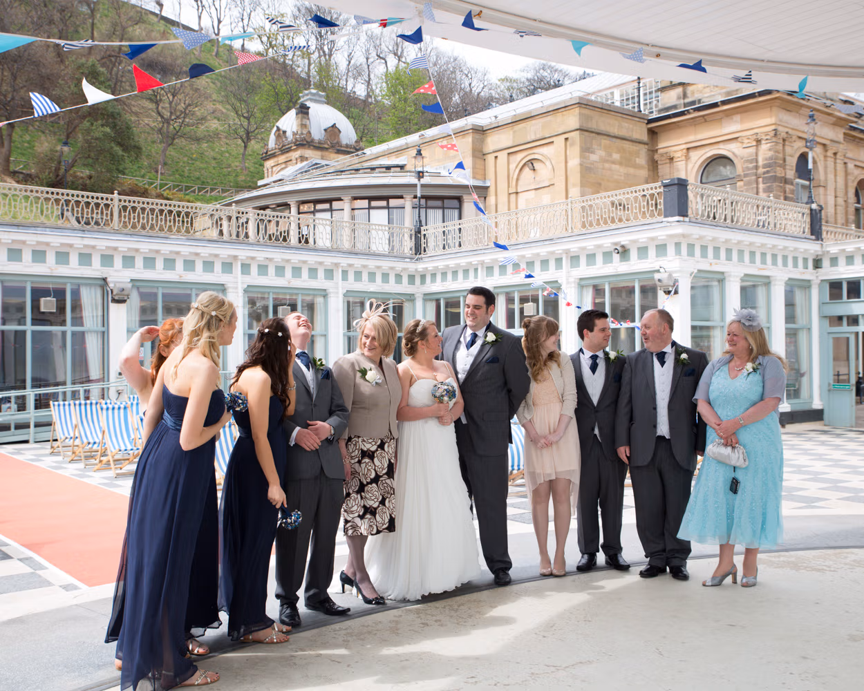 With the deckchairs and the Spa framing everything perfectly, the photos felt natural and unforced. Family gathered easily, laughter slipped in between frames, and the mood stayed playful — exactly right for a May wedding by the sea.