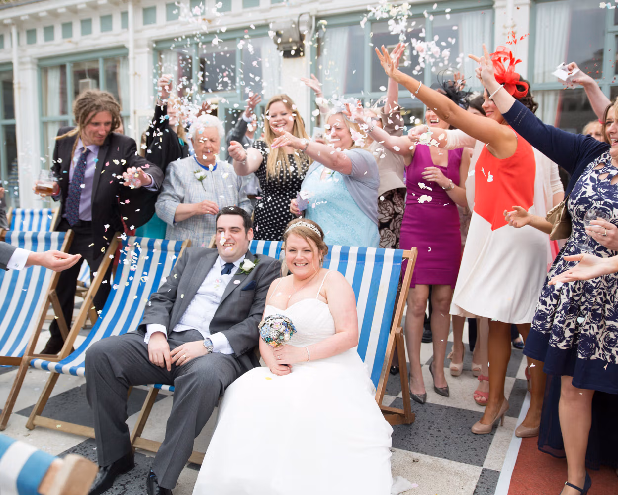 Lisa and Oliver took their seats right in the middle of the deckchairs, guests lining up behind them, confetti at the ready. The breeze — perfectly timed — carried it forward in a joyful swirl. A burst of colour, cheers all around, and a kiss right at the centre of it all.