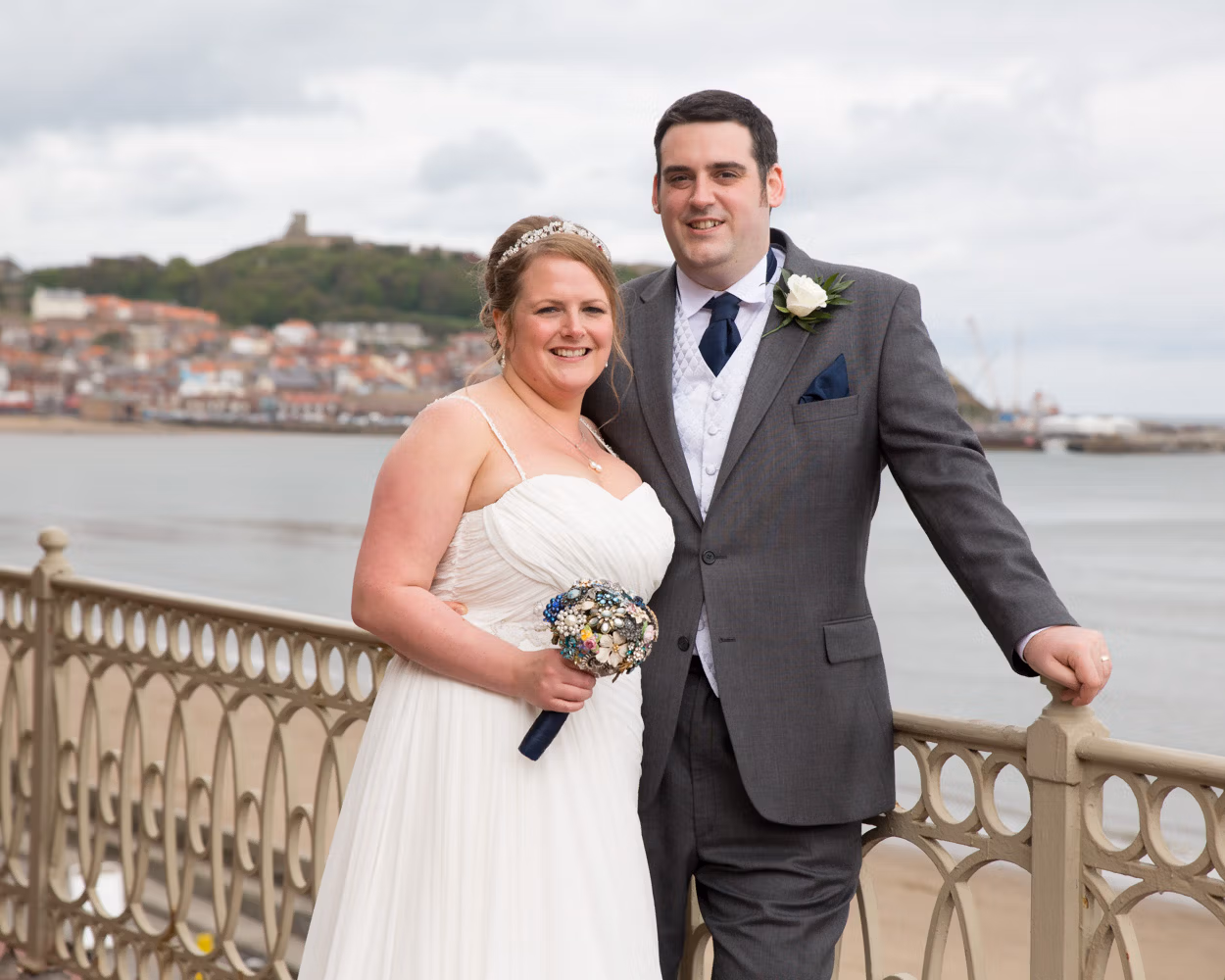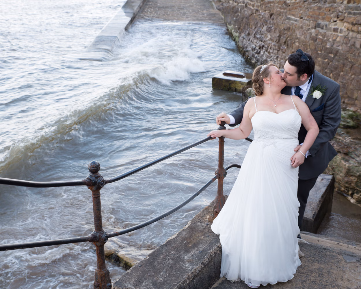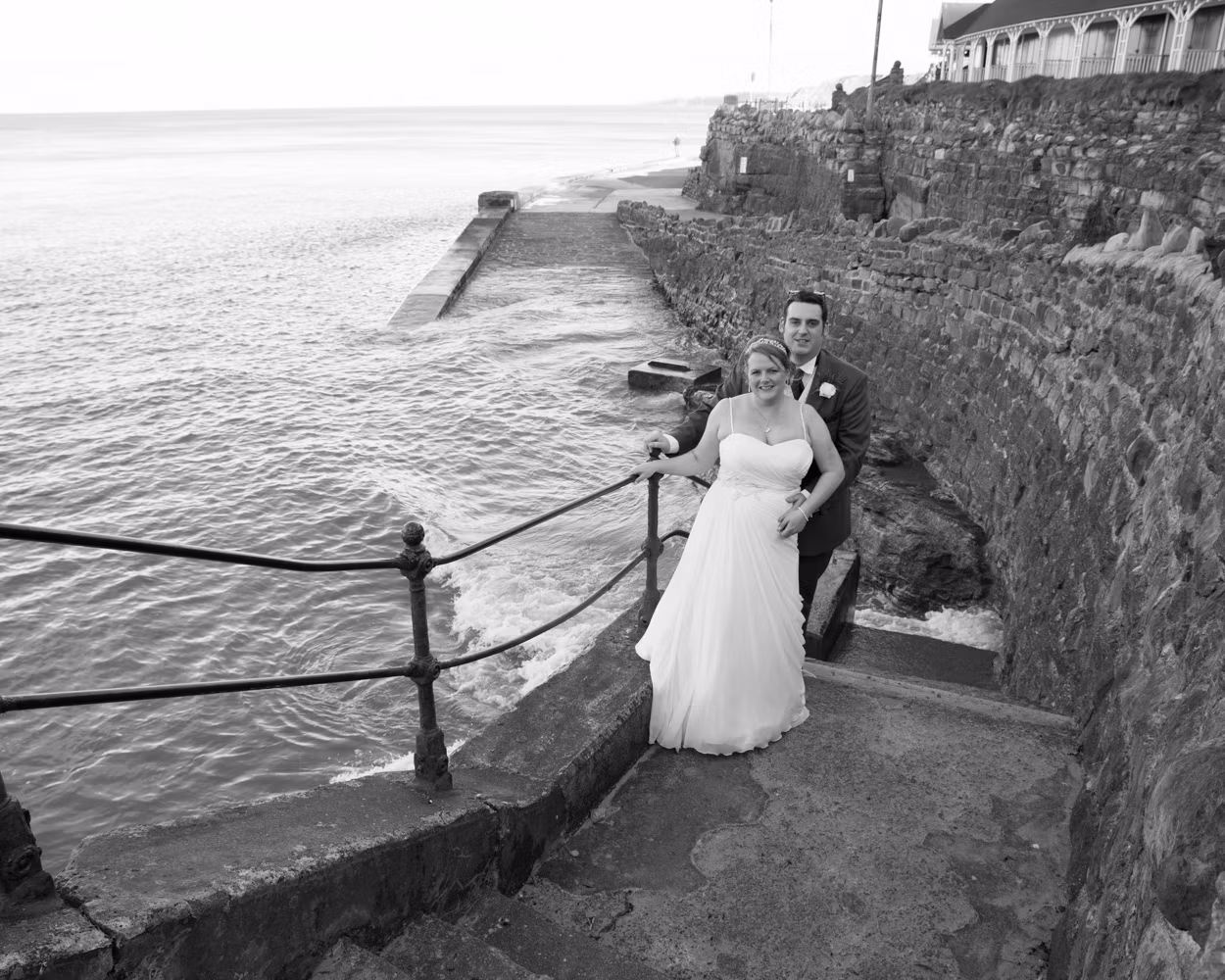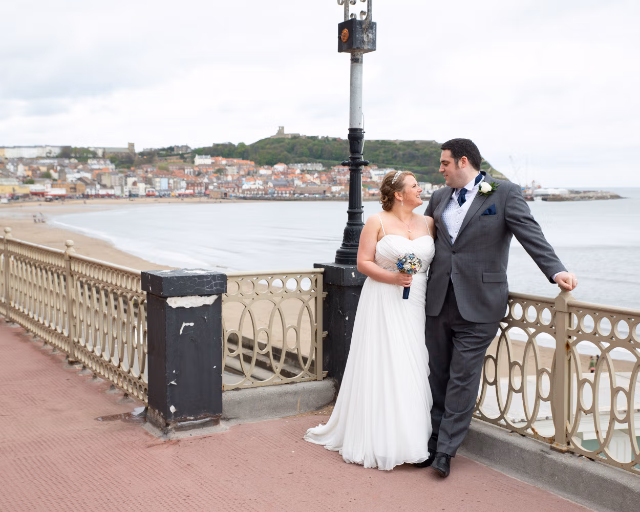 With no shortage of backdrops, we stepped straight outside and across the road for their couple portraits. Victorian railings and old lampposts lined the promenade, while the sandy beach and calm sea stretched out below. Moody skies rolled overhead, framing the coast perfectly.