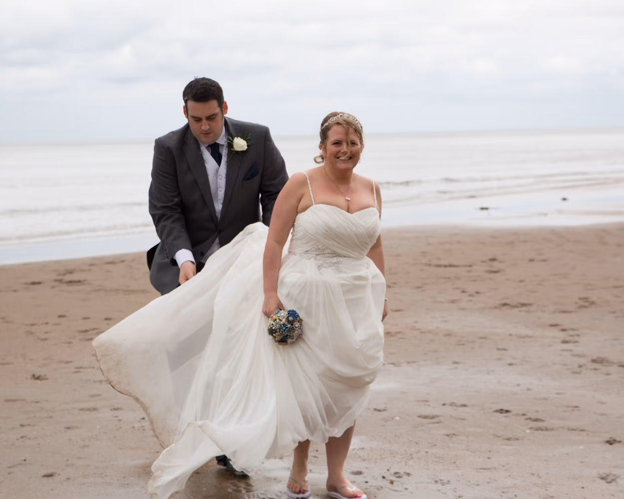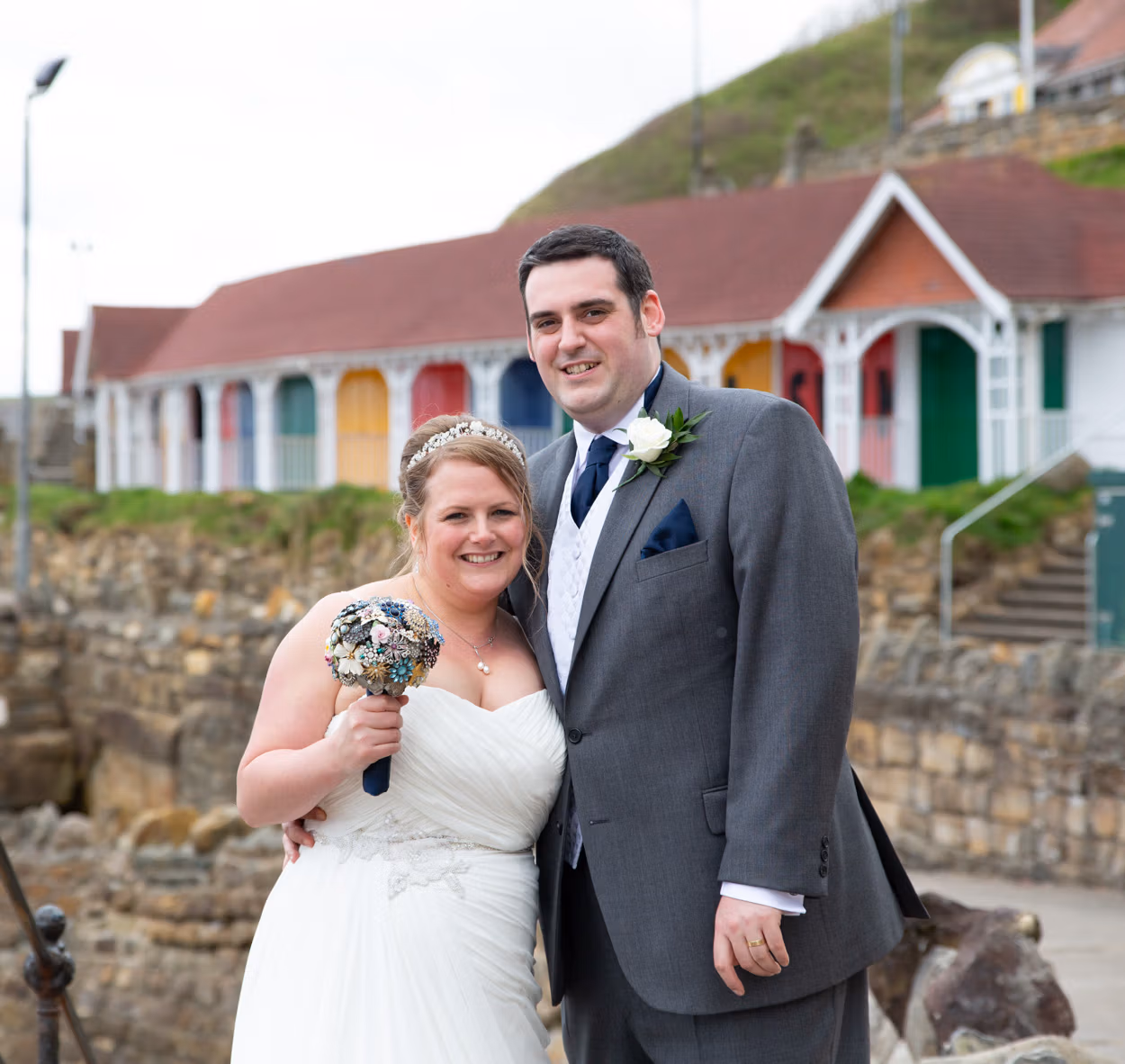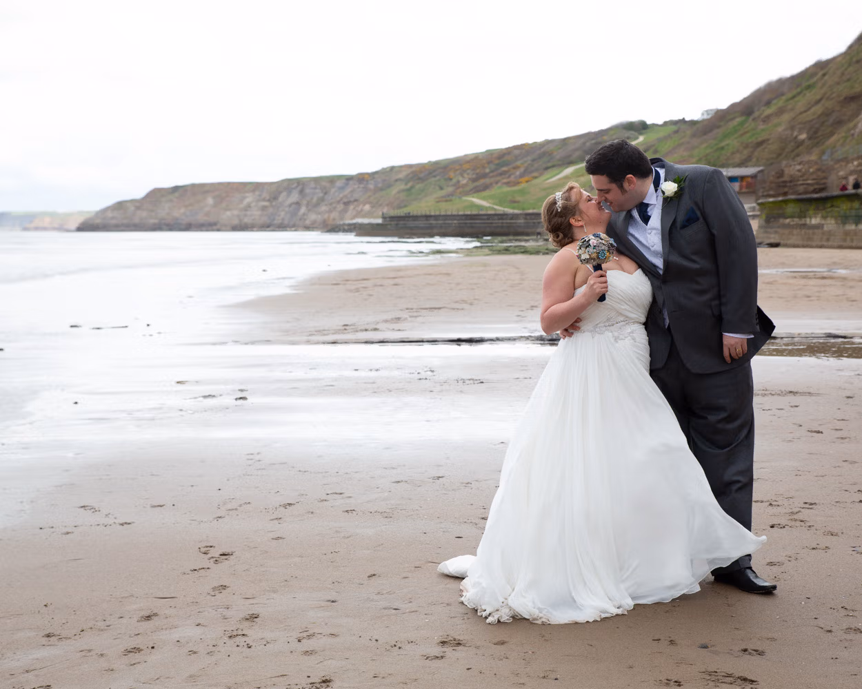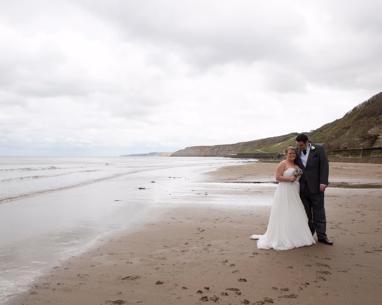 With no shortage of backdrops, we stepped straight outside and across the road for their couple portraits. Victorian railings and old lampposts lined the promenade, while the sandy beach and calm sea stretched out below. Moody skies rolled overhead, framing the coast perfectly.
