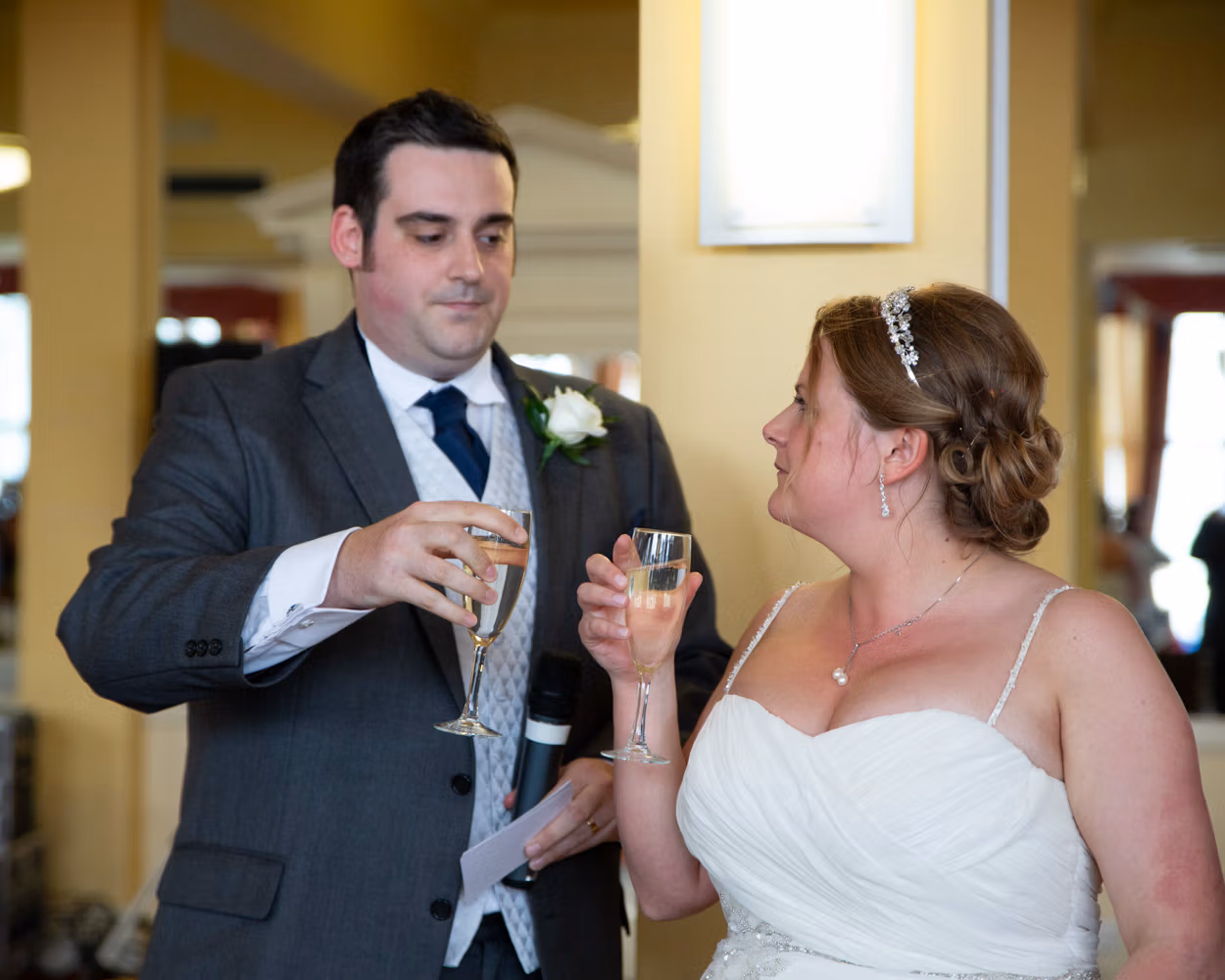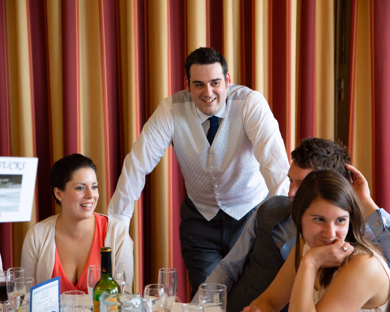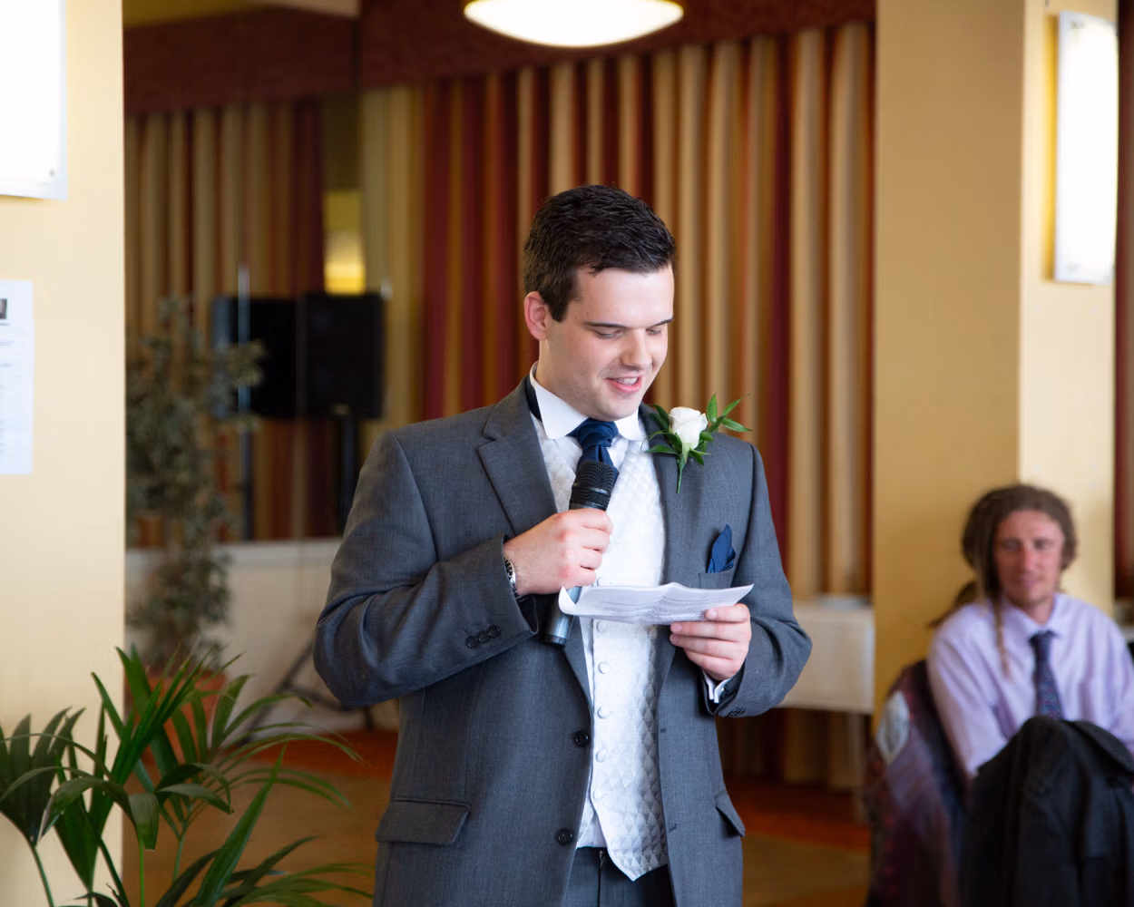 Lisa and Oliver entered to warm applause and smiling faces — the kind of welcome that instantly softens any nerves. Speeches came before the food, often a brave move, but here it worked perfectly. Laughter settled the room, emotions landed gently, and no one seemed to mind the wait.