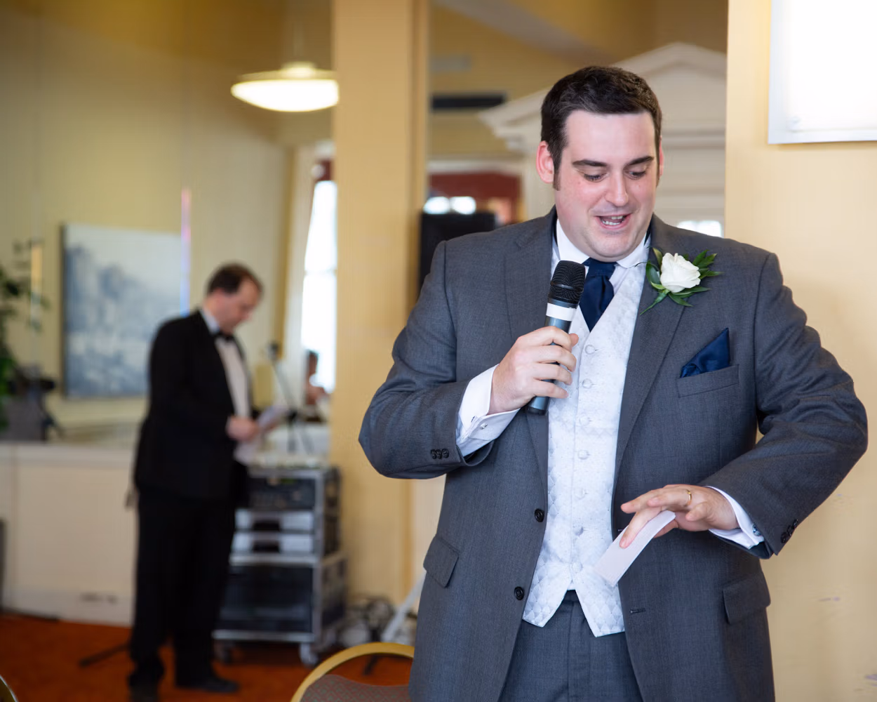 Inside the pavilion, the groom and his best man waited together. I interrupted them gently for a few relaxed photographs — quiet anticipation, shared smiles, and that sense of everything about to begin.