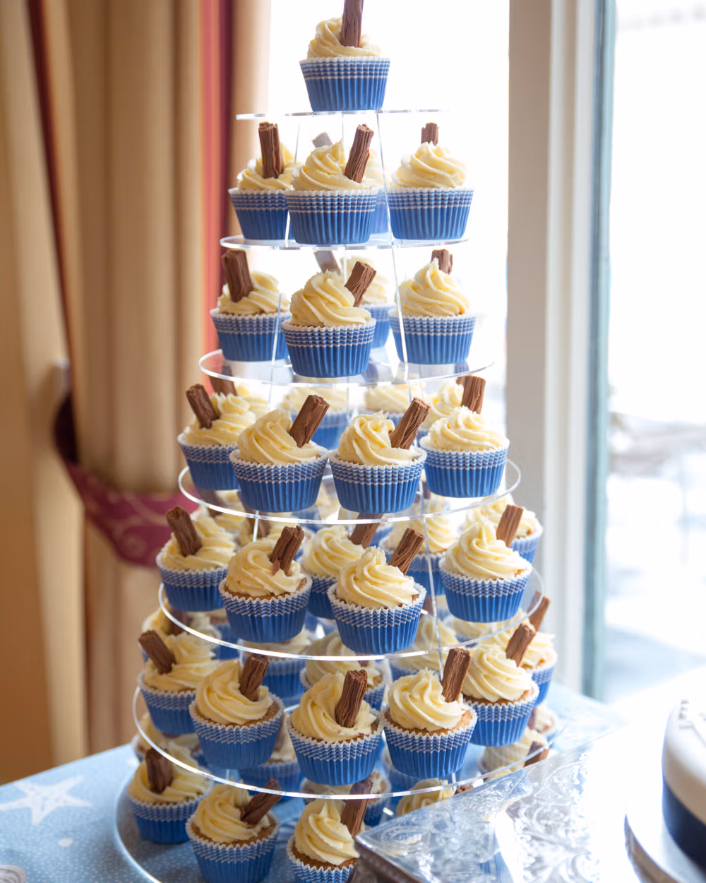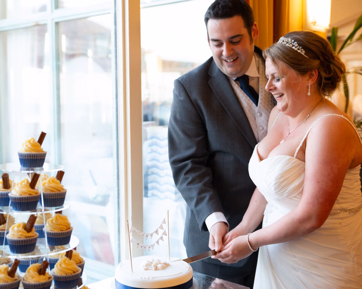 The wedding breakfast leaned fully into the seaside spirit. To begin, baguette with cheese and tomato salad was served around the tables, while nearby a tower of 99-flake–style cupcakes and a simple wedding cake sat waiting — finished with delicate shell details in the icing and photographed quietly before the room filled.