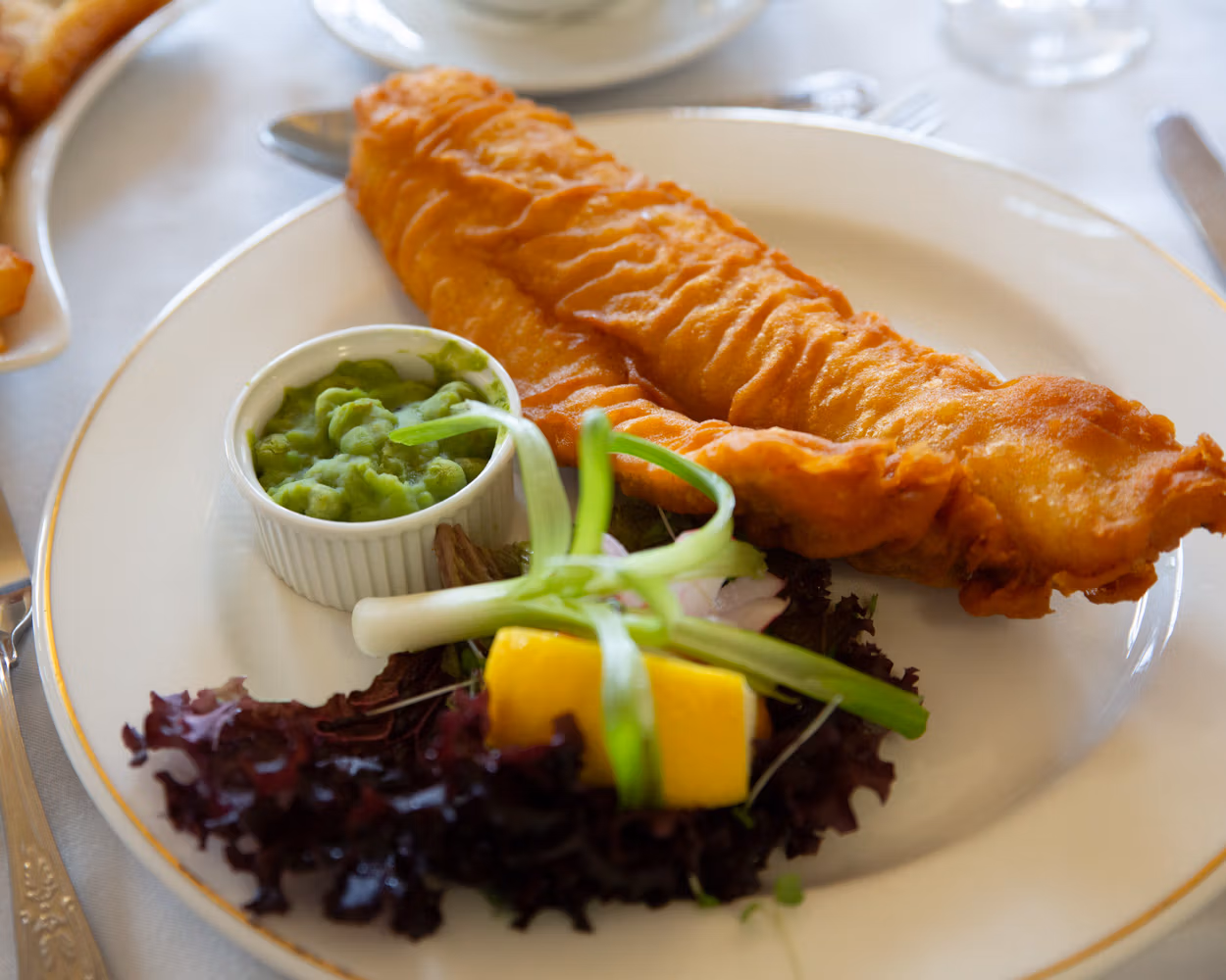Lisa and Oliver wandered from table to table, greeting guests properly, pausing for conversations and laughter before the main meal arrived. When it did, it couldn’t have felt more fitting — fish and chips served with lemon wedges, salad, and, of course, mushy peas. Familiar, comforting, and exactly right.