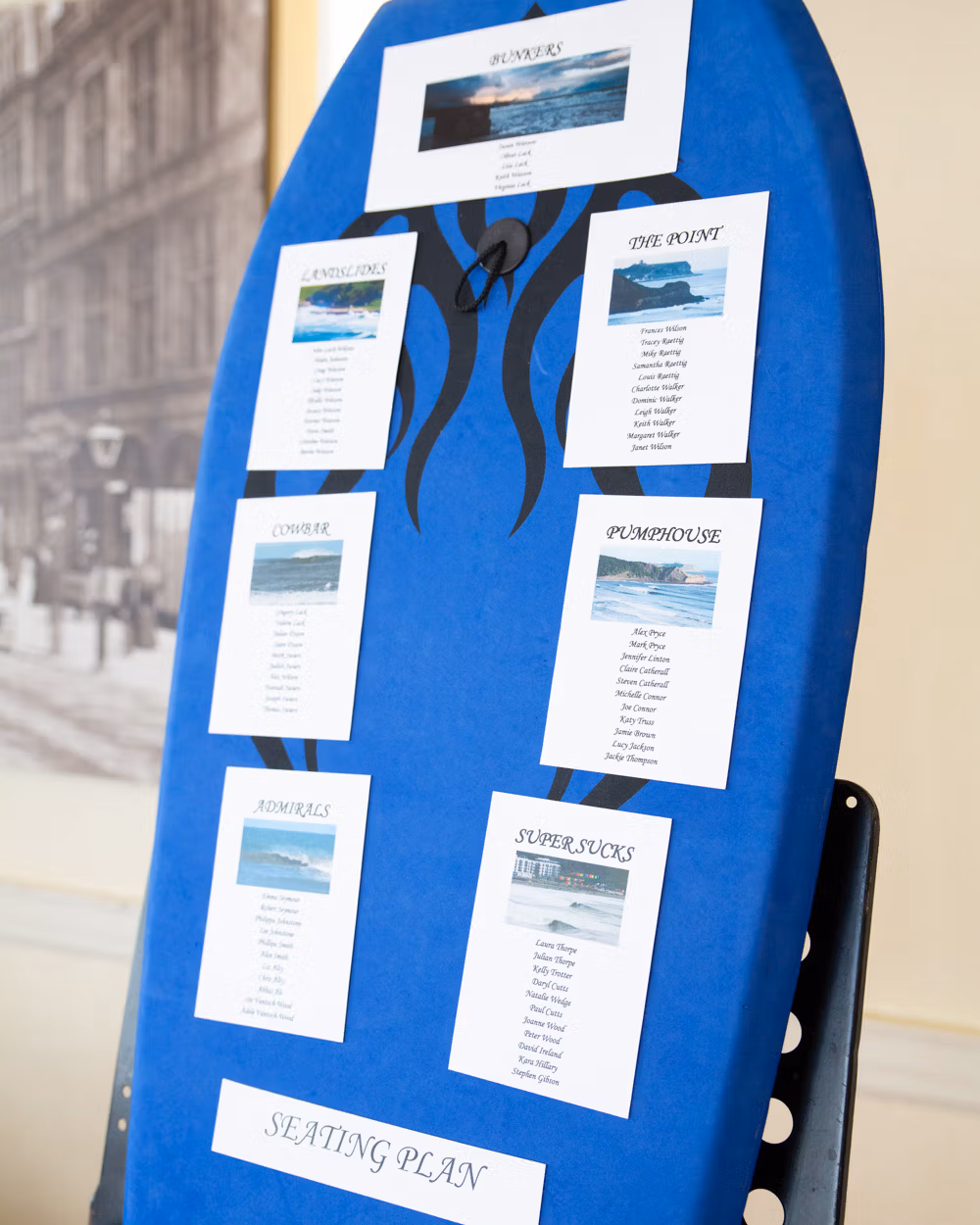 Little details kept catching the eye as the afternoon settled. A surfboard-shaped table plan. A stand of flip-flops ready for anyone heading back out to the beach. Knickerbocker glory waiting later as dessert. Every choice felt thoughtful and personal, perfectly in tune with the day they’d created.