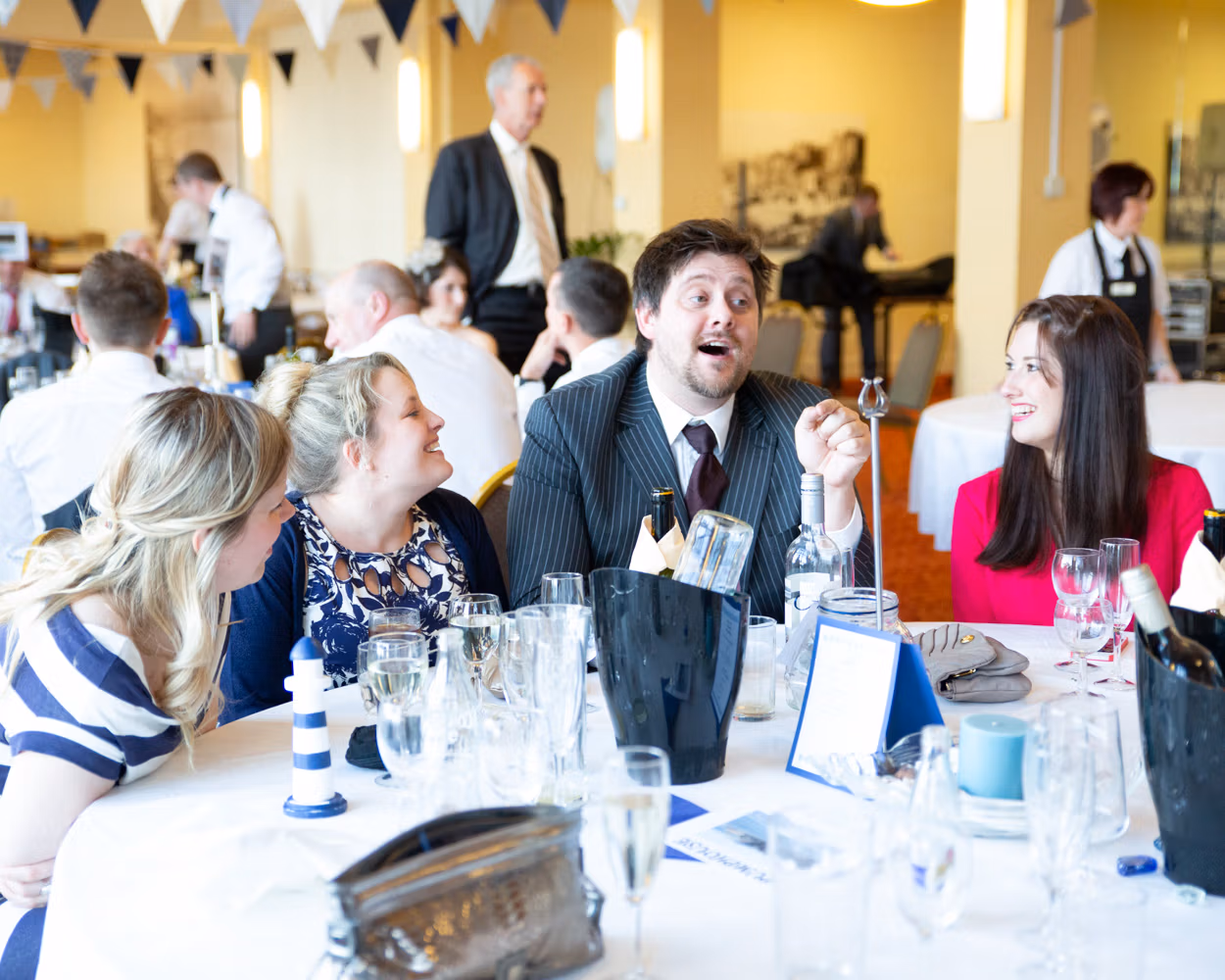 The room was full of small seaside details the moment guests arrived. Napkins folded into shells, faux goldfish floating gently in water as name tags, and candles nestled among real shells and windmills on the tables. Thoughtful, playful touches that felt completely in tune with the day.