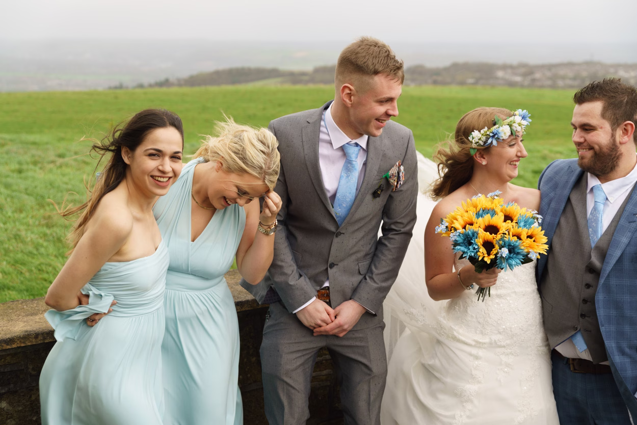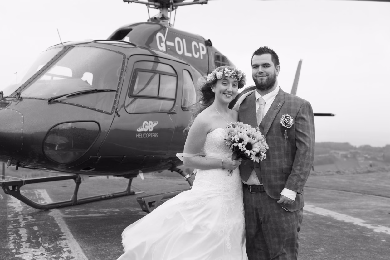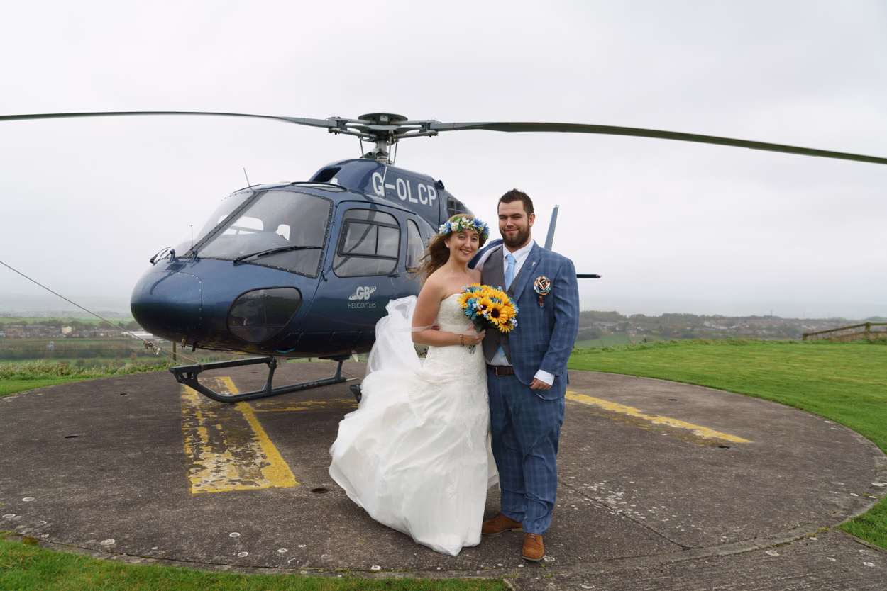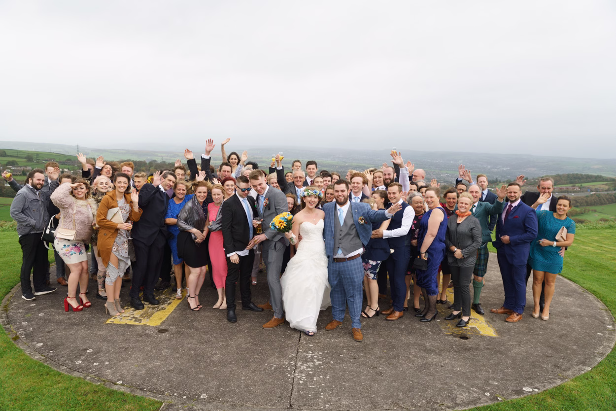 Julia and Scott were absolute stars on their October wedding at Pennine Manor Hotel in Huddersfield. The wind was wild, yet the couple—and all their guests—bravely ventured onto the helipad for the planned group photo. Hats off to everyone for embracing the gusts!