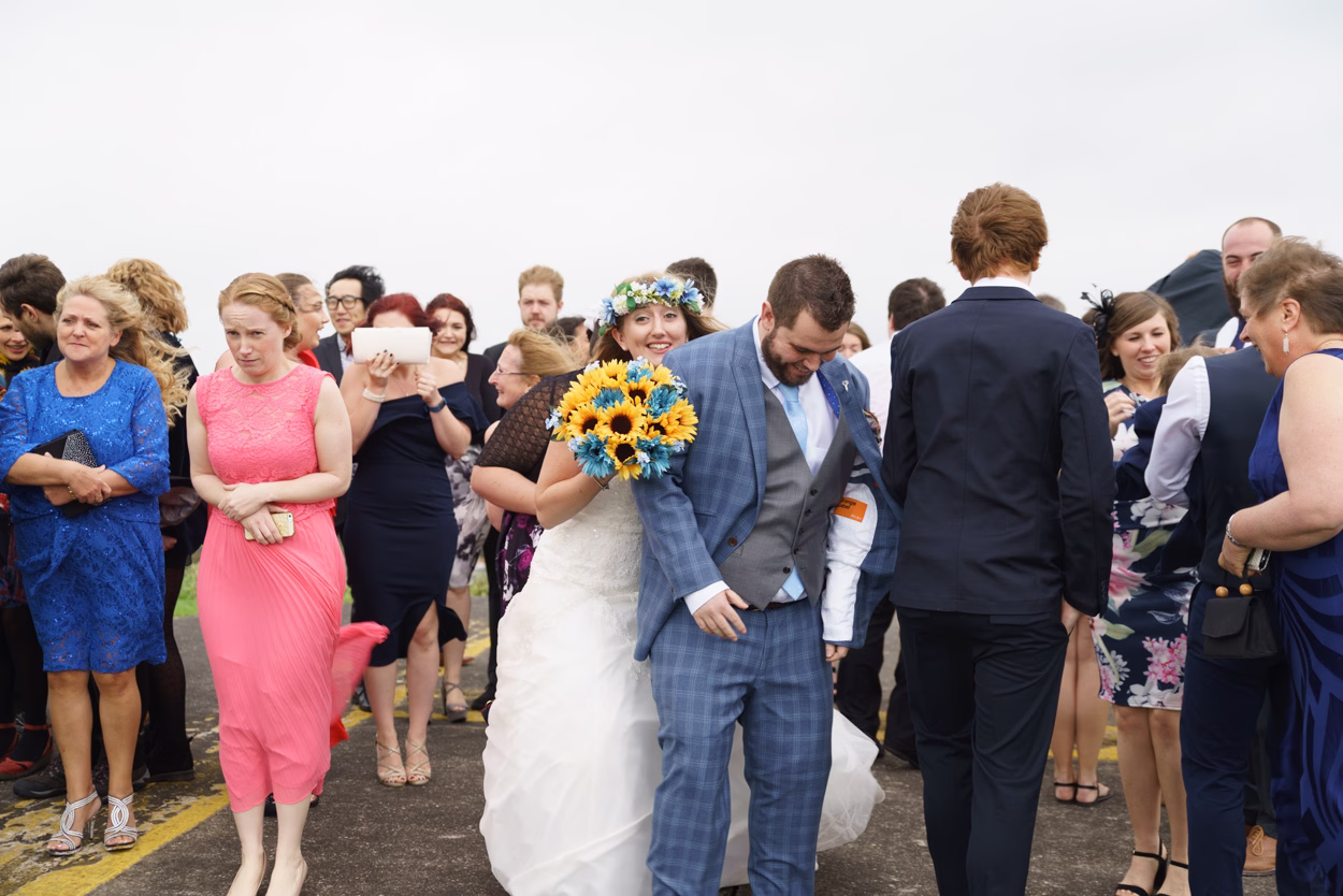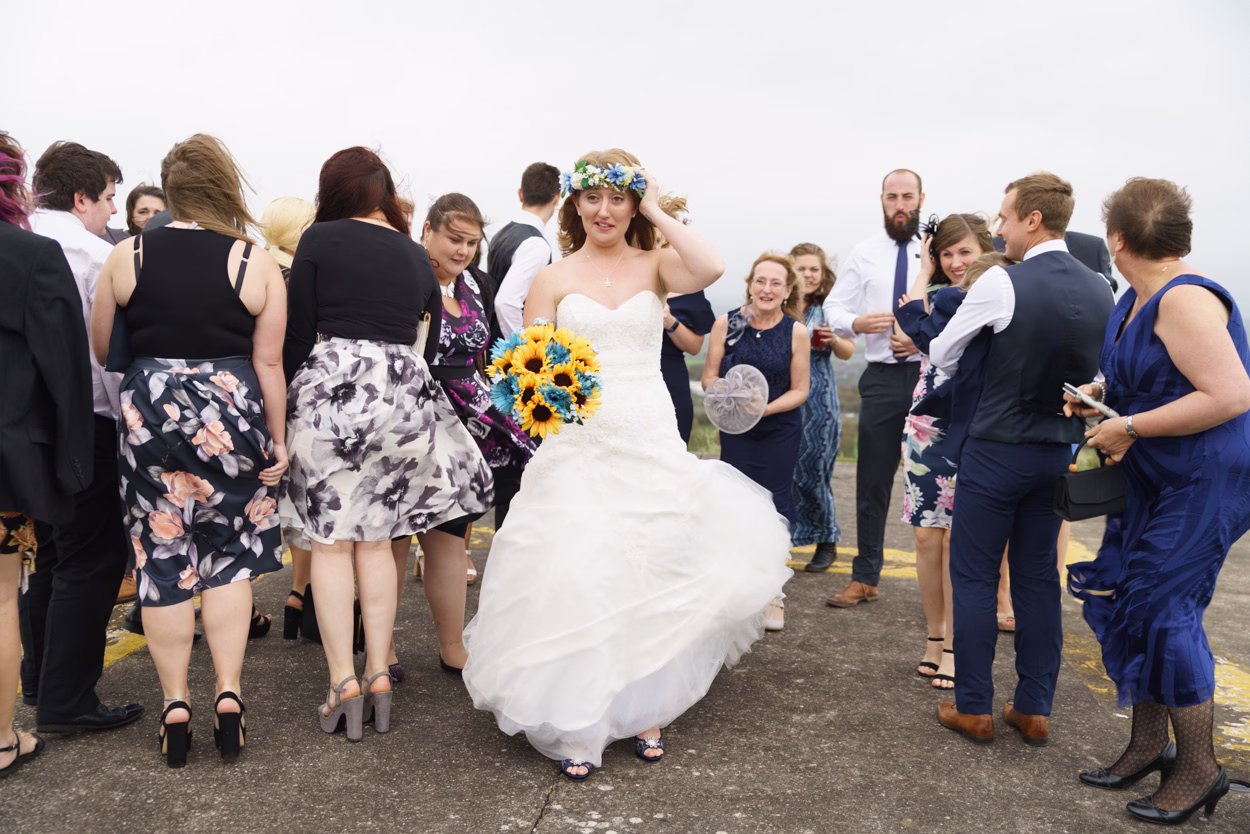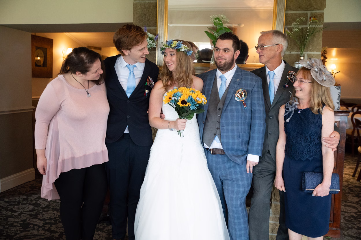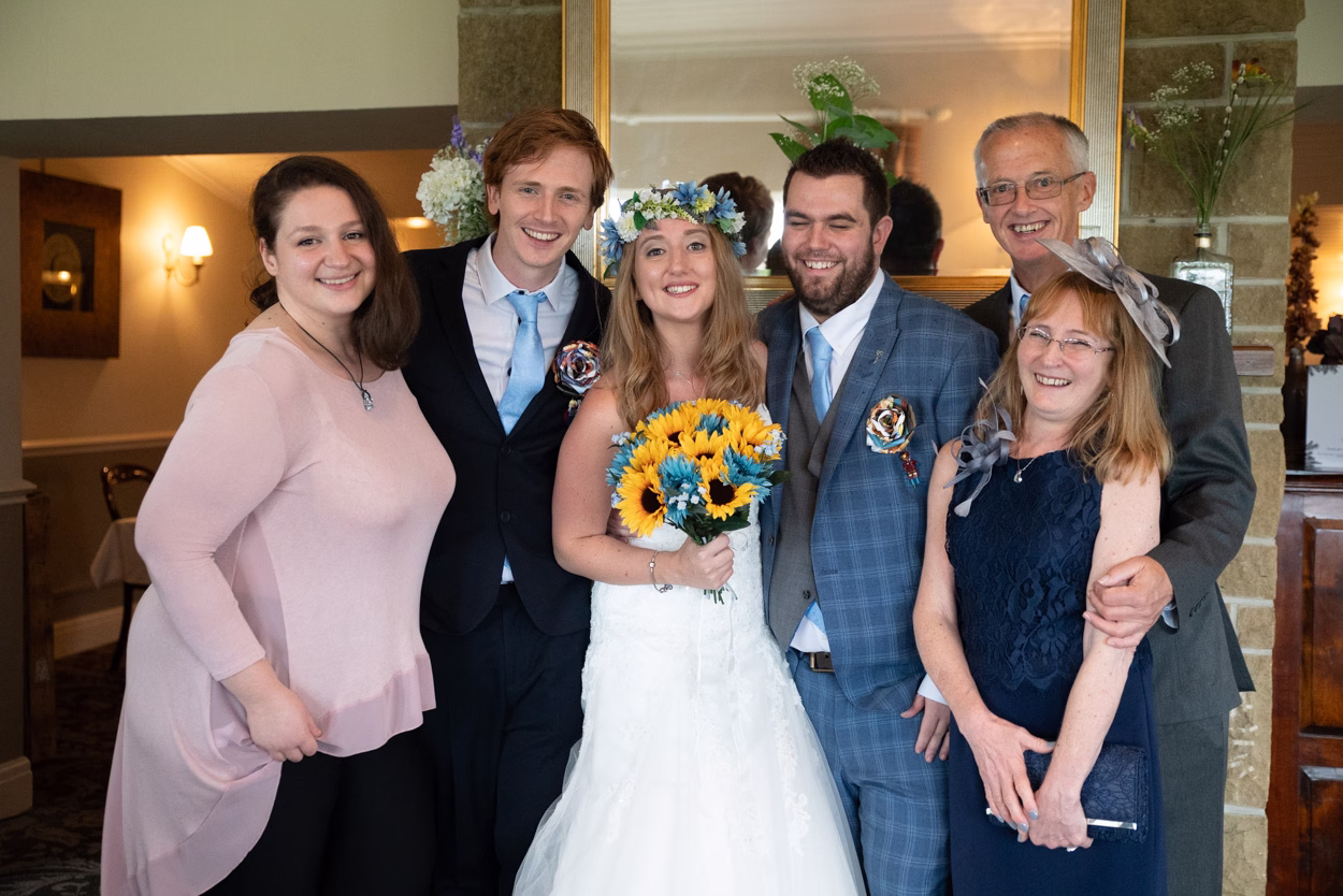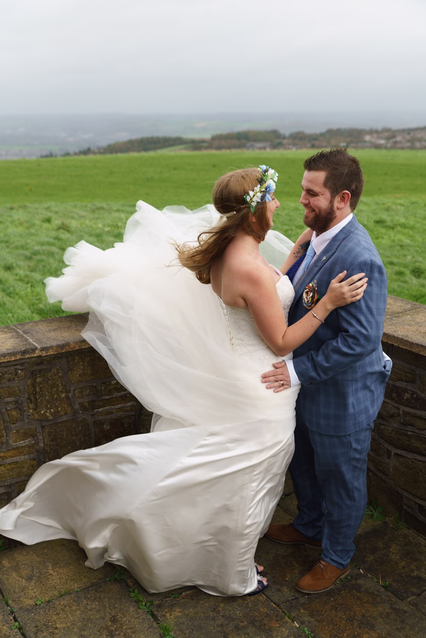 Julia and Scott were absolute stars on their October wedding at Pennine Manor Hotel in Huddersfield. The wind was wild, yet the couple—and all their guests—bravely ventured onto the helipad for the planned group photo. Hats off to everyone for embracing the gusts!