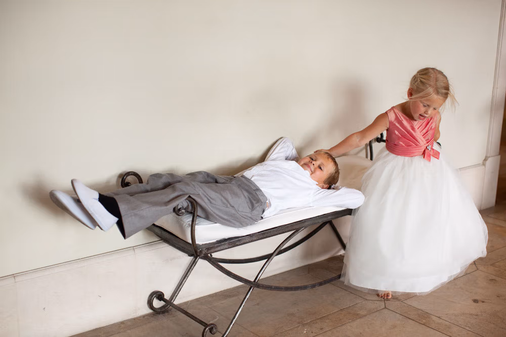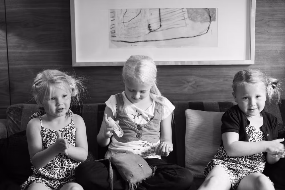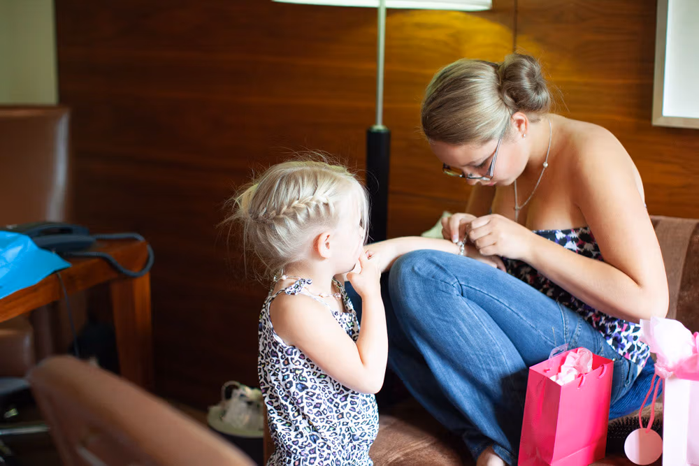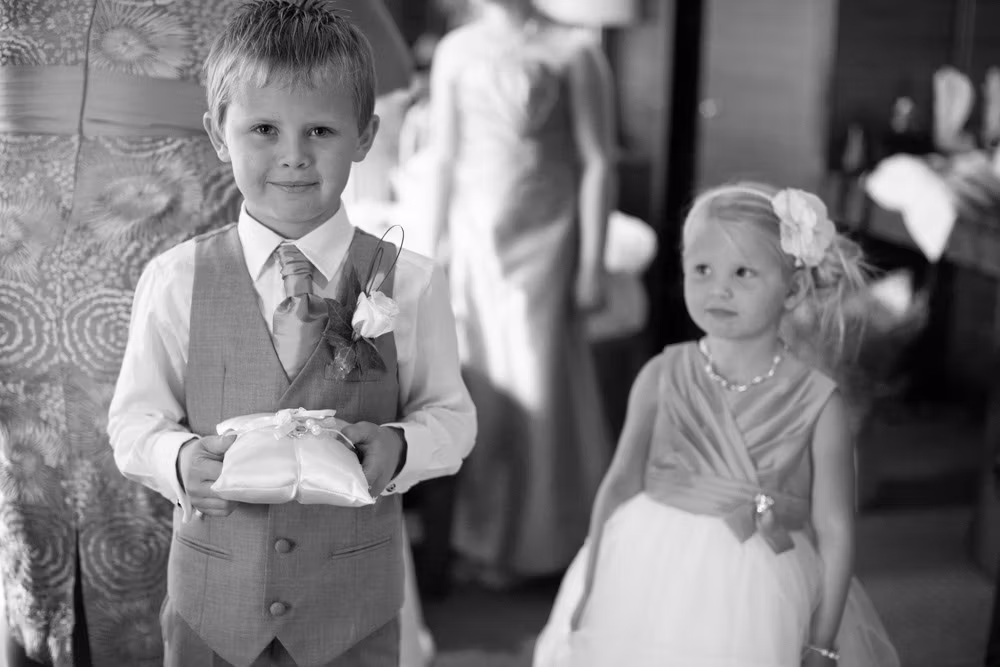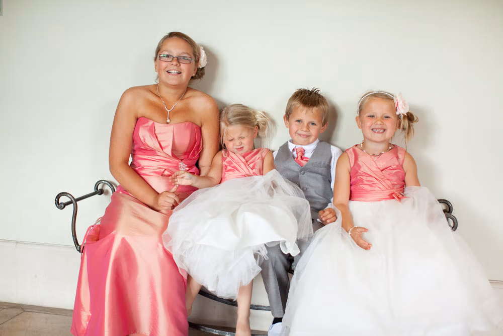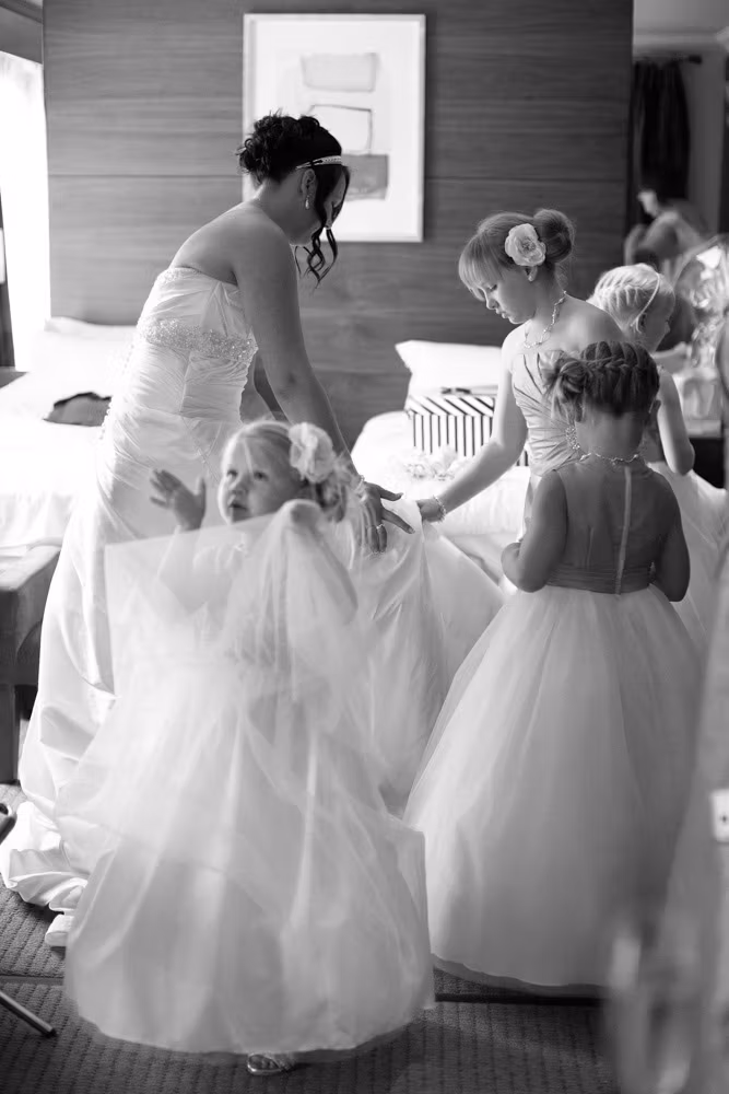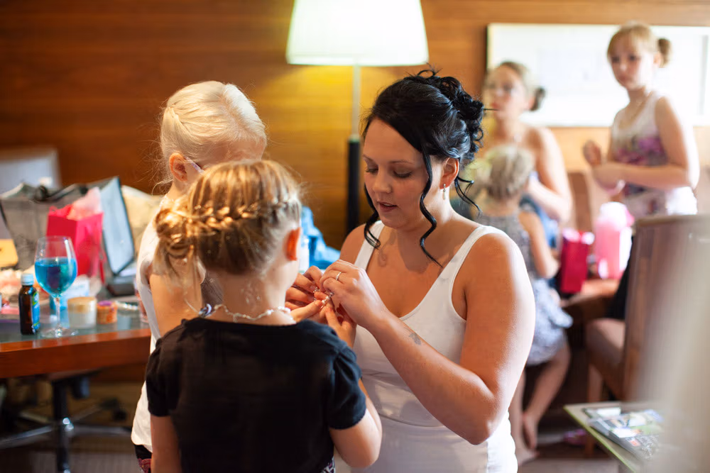 The morning began with a mix of calm and chaos, just as wedding mornings often do. In one corner, bridesmaids carefully laid out dresses, rings, and little details ready for the day. In another, the room was alive with chatter, laughter, and the happy bustle of children.