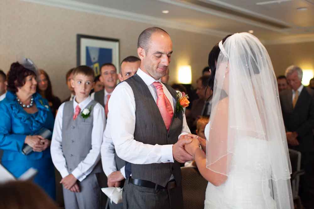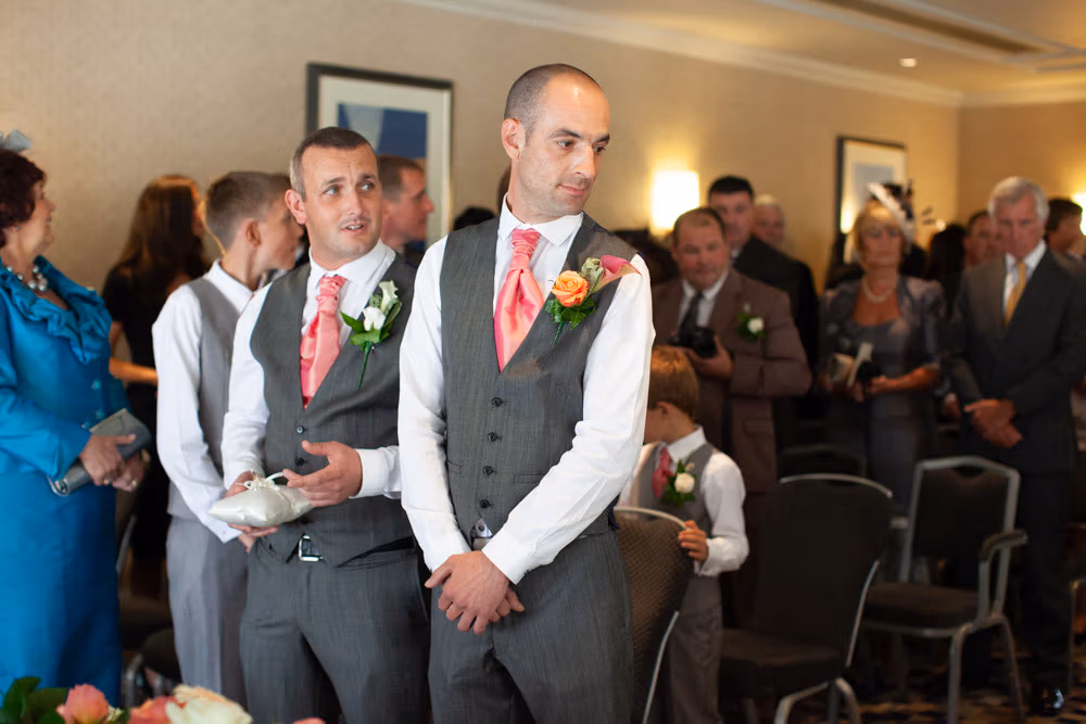 The ceremony room was filled with anticipation and quiet excitement. The groomsmen, dressed in sharp grey suits and bright white shoes, shared easy laughs that helped break the tension. Standing alongside his best man, Dave tried to keep calm, but his eyes said it all.